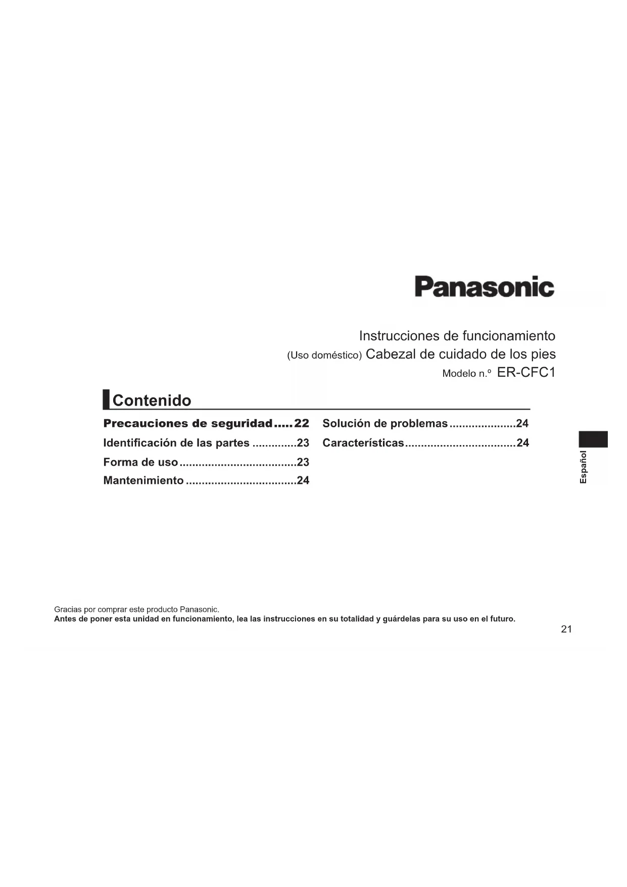 - La vida útil es de 1 año aproximadamente (si se utiliza una sola vez cada dos semanas durante unos 10 minutos aproximadamente cada vez). Solución de problemas Problema AcciónEl aparato no funciona.Vuelva a colocar la estructura.El aparato se detiene durante el funcionamiento.El contacto con la piel debe ejercerse con una fuerza suave.No puede limar.La lima está gastada. Póngase en contacto con un centro de servicios autorizado para comprarlo.No se puede eliminar el olor.Sumerja la lima en agua durante 24 horas aproximadamente antes de lavarla.Si los problemas siguen sin solucionarse, póngase en contacto con su distribuidor o con un centro de servicio autorizado por Panasonic para su reparación. Características Ruido acústico aerotransportado 65 (dB (A) re 1 pW) Este producto está destinado solamente para su uso doméstico.25 Nederlands Gebruiksaanwijzing (Huishoudelijk gebruik) Voetverzorgingskop Model Nr. ER‑CFC1 Hartelijk dank voor uw aankoop van dit Panasonic product.Lees voor gebruik van dit apparaat deze instructies en bewaar ze om ze later te raadplegen. Veiligheidsmaatregelen 26 De onderdelen....................................27 Hoe gebruiken....................................27 Onderhoud .........................................28 Probleemoplossing ...........................28 Specicaties.......................................28 Inhoud26 Nederlands WAARSCHUWING