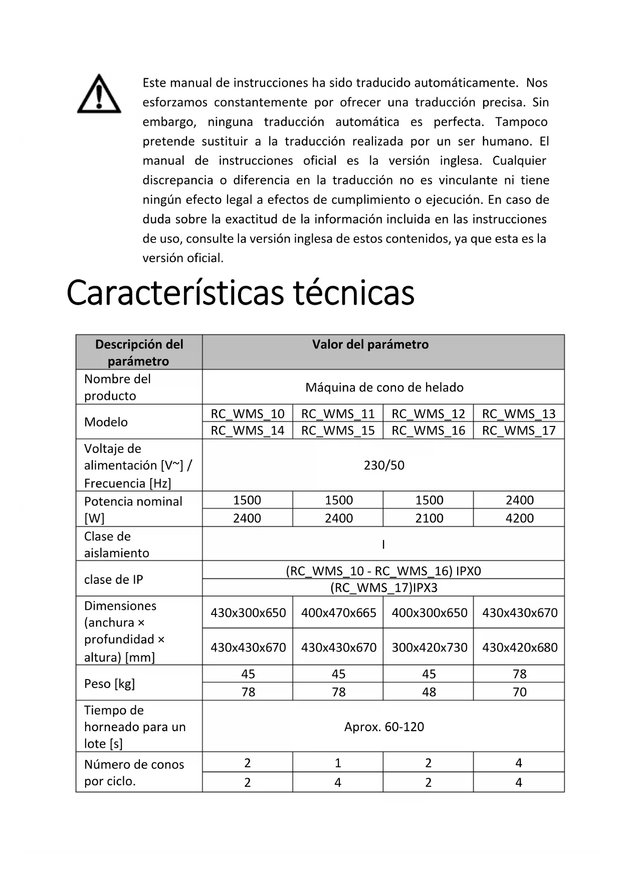 ¡ADVERTENCIA! Lea todas las advertencias e instrucciones de seguridad. El incumplimiento de las advertencias e instrucciones puede provocar descargas eléctricas, incendios y/o lesiones graves o la muerte. El término "dispositivo" o "producto" en las advertencias y la descripción de las instrucciones se refiere a: Máquina de conos de helado. 2.1. Seguridad eléctrica a) La clavija de la herramienta eléctrica debe coincidir con el enchufe. Nunca modificar el enchufe de ninguna manera. Usar la clavija no modificada y el enchufe de alimentación correspondiente reducirá el riesgo de choque eléctrico. b) Evite tocar las partes conectadas a tierra como tubos, radiadores, calderas y frigoríficos. Existe un mayor riesgo de descarga eléctrica si su cuerpo está conectado a tierra y toca el dispositivo mientras está expuesto a la lluvia directa, al pavimento mojado o mientras trabaja en un ambiente húmedo. El ingreso del agua a la herramienta aumenta el riesgo de avería y descargas eléctricas. c) No tocar el dispositivo con las manos mojadas o húmedas. ¡ADVERTENCIA! Las imágenes de este manual tienen carácter meramente explicativo y los detalles de su producto pueden ser diferentes.d) No usar el cable de alimentación de forma incorrecta. Nunca manipular el equipo ni sacar la clavija tirando del cable. Mantenga el cable alejado de fuentes de calor, aceite, bordes afilados o piezas móviles. Los cables dañados o enredados aumentan el riesgo de descarga eléctrica. e) Si no se puede evitar el uso del aparato en un entorno húmedo, se debe utilizar un dispositivo de corriente residual (RCD). El uso del RCD reduce el riesgo de descarga eléctrica. f) No usar el aparato si el conductor de alimentación está dañado o muestra claros signos de desgaste. El cable de alimentación dañado debe ser sustituido por un electricista cualificado o por el servicio técnico del fabricante. g) Para evitar el choque eléctrico, no sumergir el cable, el enchufe o el aparato en agua o en cualquier otro líquido. No utilizar el aparato sobre superficies mojadas. h) ATENCIÓN: ¡PELIGRO DE MUERTE! Durante la limpieza o el uso del aparato, no sumergirlo nunca en agua u otros líquidos.