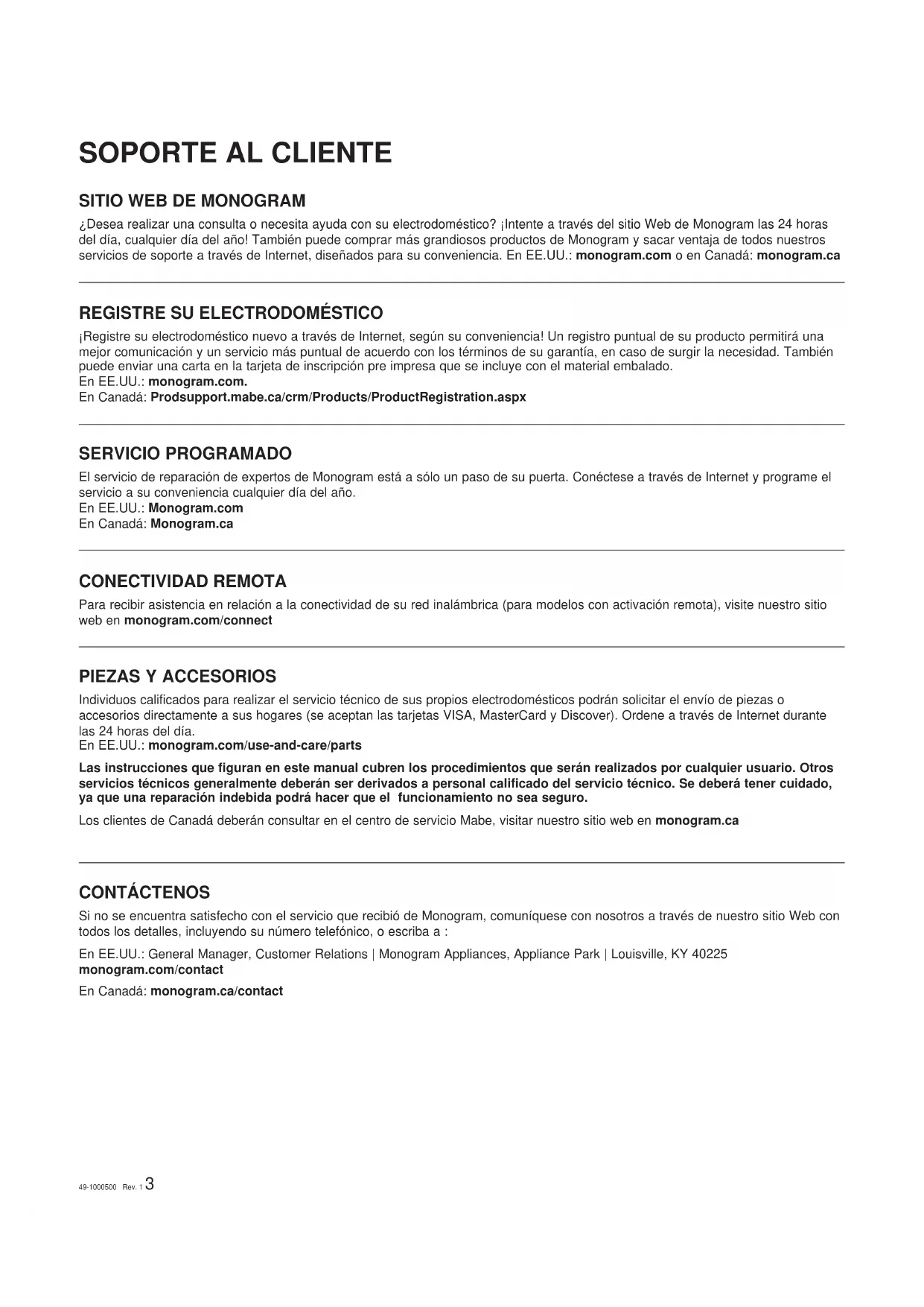 Individuos calificados para realizar el servicio técnico de sus propios electrodomésticos podrán solicitar el envío de piezas o accesorios directamente a sus hogares (se aceptan las tarjetas VISA, MasterCard y Discover). Ordene a través de Internet durante las 24 horas del día. En EE.UU.: monogram.com/use-and-care/parts Las instrucciones que figuran en este manual cubren los procedimientos que serán realizados por cualquier usuario. Otros servicios técnicos generalmente deberán ser derivados a personal calificado del servicio técnico. Se deberá tener cuidado, ya que una reparación indebida podrá hacer que el funcionamiento no sea seguro. Los clientes de Canadá deberán consultar en el centro de servicio Mabe, visitar nuestro sitio web en monogram.ca CONTÁCTENOS Si no se encuentra satisfecho con el servicio que recibió de Monogram, comuníquese con nosotros a través de nuestro sitio Web con todos los detalles, incluyendo su número telefónico, o escriba a : En EE.UU.: General Manager, Customer Relations | Monogram Appliances, Appliance Park | Louisville, KY 40225 monogram.com/contact En Canadá: monogram.ca/contact4 49-1000500 Rev. 1