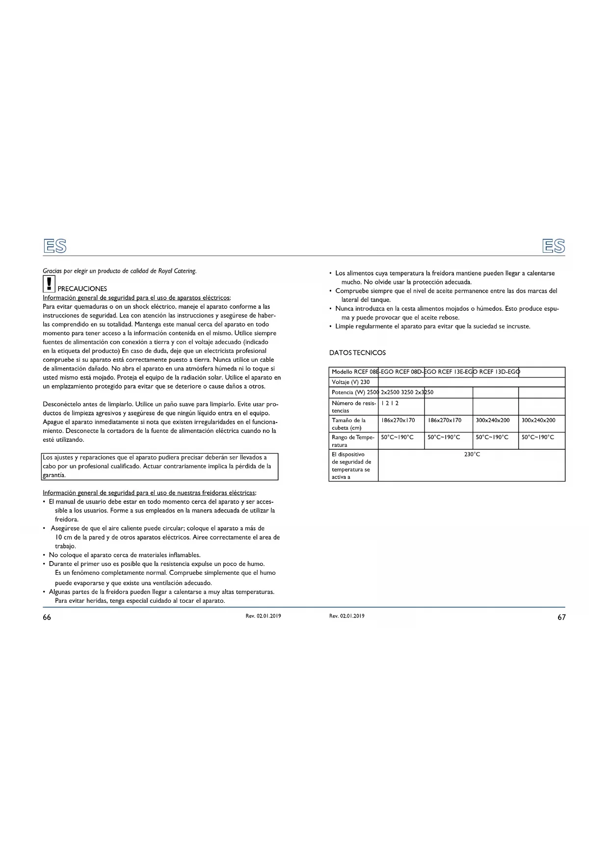 RCEF 08EGO RCEF 08D-EGO RCEF 13EGO RCEF 13D-EGO Rev. 02.01.2019Gracias por elegir un producto de calidad de Royal Catering. PRECAUCIONES Información general de seguridad para el uso de aparatos eléctricos: Para evitar quemaduras o on un shock eléctrico, maneje el aparato conforme a las instrucciones de seguridad. Lea con atención las instrucciones y asegúrese de haber- las comprendido en su totalidad. Mantenga este manual cerca del aparato en todo momento para tener acceso a la información contenida en el mismo. Utilice siempre fuentes de alimentación con conexión a tierra y con el voltaje adecuado (indicado en la etiqueta del producto) En caso de duda, deje que un electricista profesional compruebe si su aparato está correctamente puesto a tierra. Nunca utilice un cable de alimentación dañado. No abra el aparato en una atmósfera húmeda ni lo toque si usted mismo está mojado. Proteja el equipo de la radiación solar. Utilice el aparato en un emplazamiento protegido para evitar que se deteriore o cause daños a otros. Desconéctelo antes de limpiarlo. Utilice un paño suave para limpiarlo. Evite usar pro- ductos de limpieza agresivos y asegúrese de que ningún líquido entra en el equipo. Apague el aparato inmediatamente si nota que existen irregularidades en el funciona- miento. Desconecte la cortadora de la fuente de alimentación eléctrica cuando no la esté utilizando. Los ajustes y reparaciones que el aparato pudiera precisar deberán ser llevados a cabo por un profesional cualicado. Actuar contrariamente implica la pérdida de la garantía. Información general de seguridad para el uso de nuestras freidoras eléctricas: