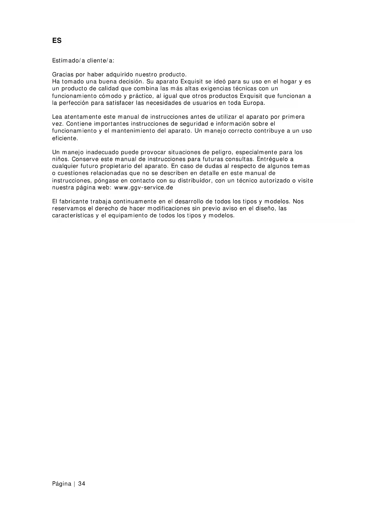- Als een apparaat wordt gerepareerd, moeten de reparatiefacturen onmiddellijk en zonder aftrek worden betaald.ES Página | 34 Estimado/a cliente/a: Gracias por haber adquirido nuestro producto. Ha tomado una buena decisión. Su aparato Exquisit se ideó para su uso en el hogar y es un producto de calidad que combina las más altas exigencias técnicas con un funcionamiento cómodo y práctico, al igual que otros productos Exquisit que funcionan a la perfección para satisfacer las necesidades de usuarios en toda Europa. Lea atentamente este manual de instrucciones antes de utilizar el aparato por primera vez. Contiene importantes instrucciones de seguridad e información sobre el funcionamiento y el mantenimiento del aparato. Un manejo correcto contribuye a un uso eficiente. Un manejo inadecuado puede provocar situaciones de peligro, especialmente para los niños. Conserve este manual de instrucciones para futuras consultas. Entréguelo a cualquier futuro propietario del aparato. En caso de dudas al respecto de algunos temas o cuestiones relacionadas que no se describen en detalle en este manual de instrucciones, póngase en contacto con su distribuidor, con un técnico autorizado o visite nuestra página web: www.ggv-service.de El fabricante trabaja continuamente en el desarrollo de todos los tipos y modelos. Nos reservamos el derecho de hacer modificaciones sin previo aviso en el diseño, las características y el equipamiento de todos los tipos y modelos.ES Página | 35 25 Seguridad