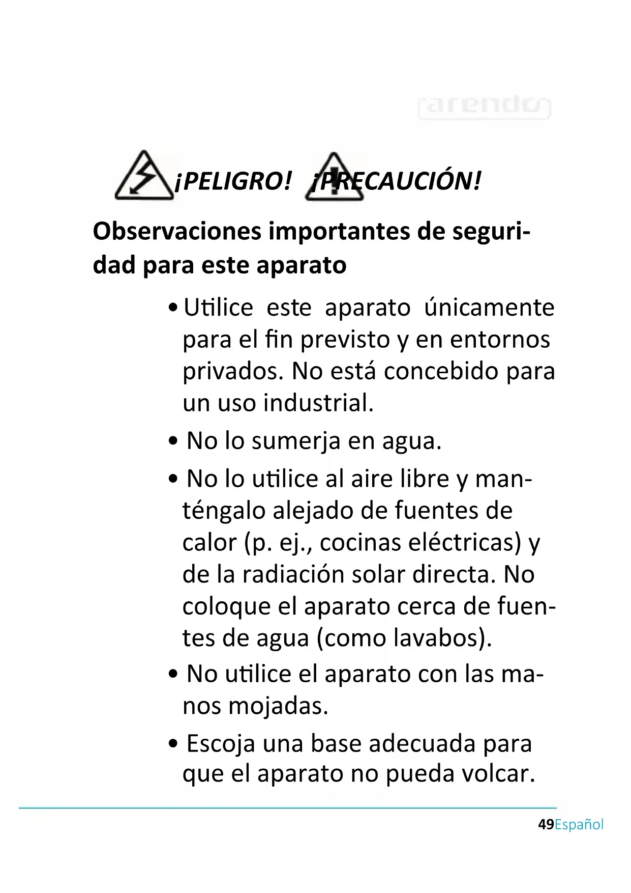 - Mantenga a los niños alejados del disposivo. Asegúrate de no jugar cerca del aparato.54 Español Gracias por escoger un producto de Arendo. Para que pueda disfrutar de su adqui- sición, le rogamos que lea atentamente las siguientes instrucciones de uso. Antes de ponerlo en marcha, compruebe que el producto suministrado no presenta de- fectos ni daños.