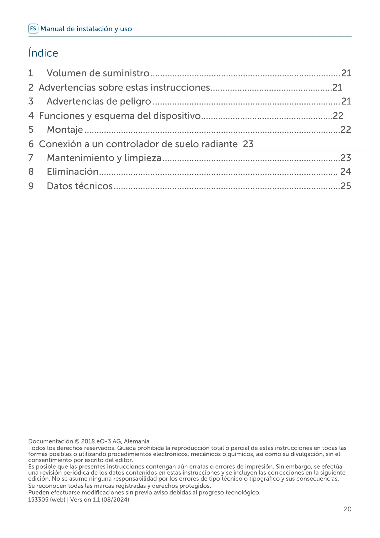 - Conecte el cable de conexión del actuador al borne correspondiente del actuador de suelo radiante. Figura 5 7 Mantenimiento y limpieza El dispositivo no requiere mante- nimiento. En caso de fallo, encar- gue su reparación a un técnico. Limpie el dispositivo con un paño sua- ve, limpio, seco y que no deje pelusa. No utilice productos de limpieza que contengan disolventes. Estas sustan- cias pueden estropear la carcasa de plástico y la rotulación.24 Eliminación 8 Eliminación Indicaciones sobre la eliminación Este símbolo significa que el dis- positivo no debe desecharse con la basura doméstica, en el conte- nedor de residuos ni el contenedor amarillo o el saco amarillo. Con el fin de proteger la salud y el medioambiente, está obligado a en- tregar el producto y todas las piezas electrónicas incluidas en el volumen de suministro para su correcta elimi- nación en un punto de recogida de residuos municipal para aparatos eléc- tricos y electrónicos. Los distribuidores de aparatos eléctricos y electrónicos también están obligados a la recogida gratuita de dispositivos usados. Mediante la recogida por separado, contribuye significativamente a la re- utilización, el reciclado y otras formas de recuperación de dispositivos usa- dos. Le advertimos expresamente sobre el hecho de que usted, como usuario final, es responsable de eliminar los datos personales de los aparatos eléc- tricos y electrónicos usados que se van a desechar. Información relativa a la conformidad El distintivo CE es un símbolo de mercado libre dirigido exclusiva- mente a las autoridades y que no implica ninguna garantía de de- terminadas características. Para consultas técnicas sobre el dispositivo contacte con su pro- veedor.25 Datos técnicos 9 Datos técnicos Nombre abreviado del dispositivo: HmIP-VDMOT Tensión de alimentación: 3,3 VDC, SELV Consumo de corriente: máx. 120 mA Tipo de protección: IP20 Clase de protección: III Temperatura ambiente: de 0 a 50 °C Modo de funcionamiento: tipo 1 Conexión: M30 x 1,5 mm Grado de suciedad: 2 Recorrido lineal: 4,3 ±0,3 mm Dimensiones: 44 x 54 x 50 mm (sin cable de cone- xión) Peso: 80g Salvo modificaciones técnicas.26 Documentazione © 2018 eQ-3 AG, Germania Tutti i diritti riservati. Senza l’approvazione scritta del produttore è vietata la riproduzione di questo manuale o di sue parti in qualsiasi forma o la sua duplicazione o modifica con l’utilizzo di processi elettronici, meccanici o chimici. Questo manuale potrebbe presentare difetti dovuti alla tecnica di stampa o errori di stampa. Tuttavia le informazi- oni qui contenute vengono costantemente verificate ed eventualmente corrette nell'edizione successiva. Si declina qualsiasi responsabilità per errori di tipo tecnico o di stampa e per le loro conseguenze. Si riconoscono tutti i marchi depositati e i diritti di proprietà. Non si escludono modifiche apportate senza preavviso conformemente agli sviluppi tecnici. 153305 (web) | Versione 1.1 (08/2024) Istruzioni per l‘installazione e l‘uso
