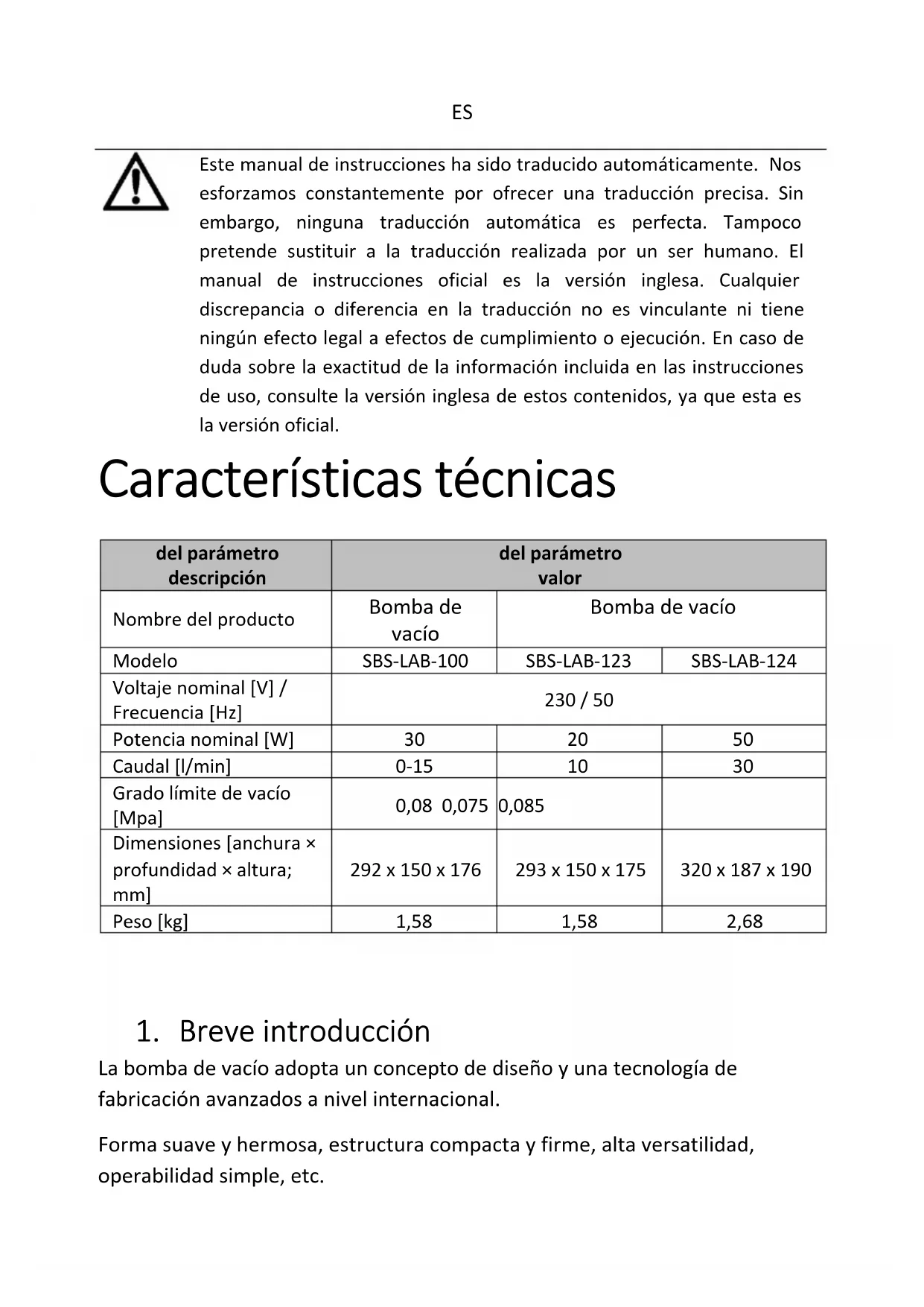 Este manual de instrucciones ha sido traducido automáticamente. Nos esforzamos constantemente por ofrecer una traducción precisa. Sin embargo, ninguna traducción automática es perfecta. Tampoco pretende sustituir a la traducción realizada por un ser humano. El manual de instrucciones oficial es la versión inglesa. Cualquier discrepancia o diferencia en la traducción no es vinculante ni tiene ningún efecto legal a efectos de cumplimiento o ejecución. En caso de duda sobre la exactitud de la información incluida en las instrucciones de uso, consulte la versión inglesa de estos contenidos, ya que esta es la versión oficial. Características técnicas del parámetro descripción del parámetro valor Nombre del producto Bomba de vacío Bomba de vacío Modelo SBS-LAB-100 SBS-LAB-123 SBS-LAB-124 Voltaje nominal [V] / Frecuencia [Hz] 230 / 50 Potencia nominal [W]