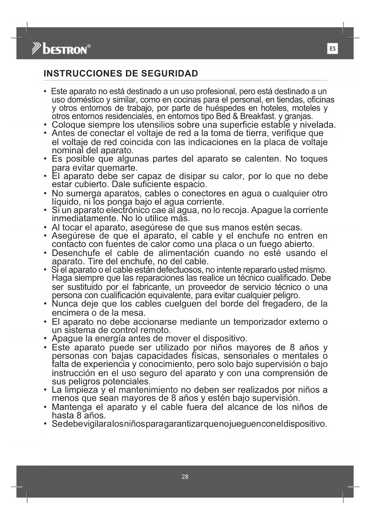 - Su municipio puede indicarle dónde encontrar el punto de recogida de residuos designado en su barrio. SERVICIO En el improbable caso de que se produzca un mal funcionamiento, póngase en contacto con el servicio de atención al cliente de Bestron: www.bestron.com/service Especificaciones técnicas Modelo AMN100CO Red eléctrica 230V~ Frecuencia(Hz) 50 Clase de seguridad 1 Potencia (vatios) Potencia de entrada 1150W Potencia de salida 700W Ruido (dB(A)) - Capacidad máxima ca. 20L Tiempo máximo de funcionamiento continuo (KB)