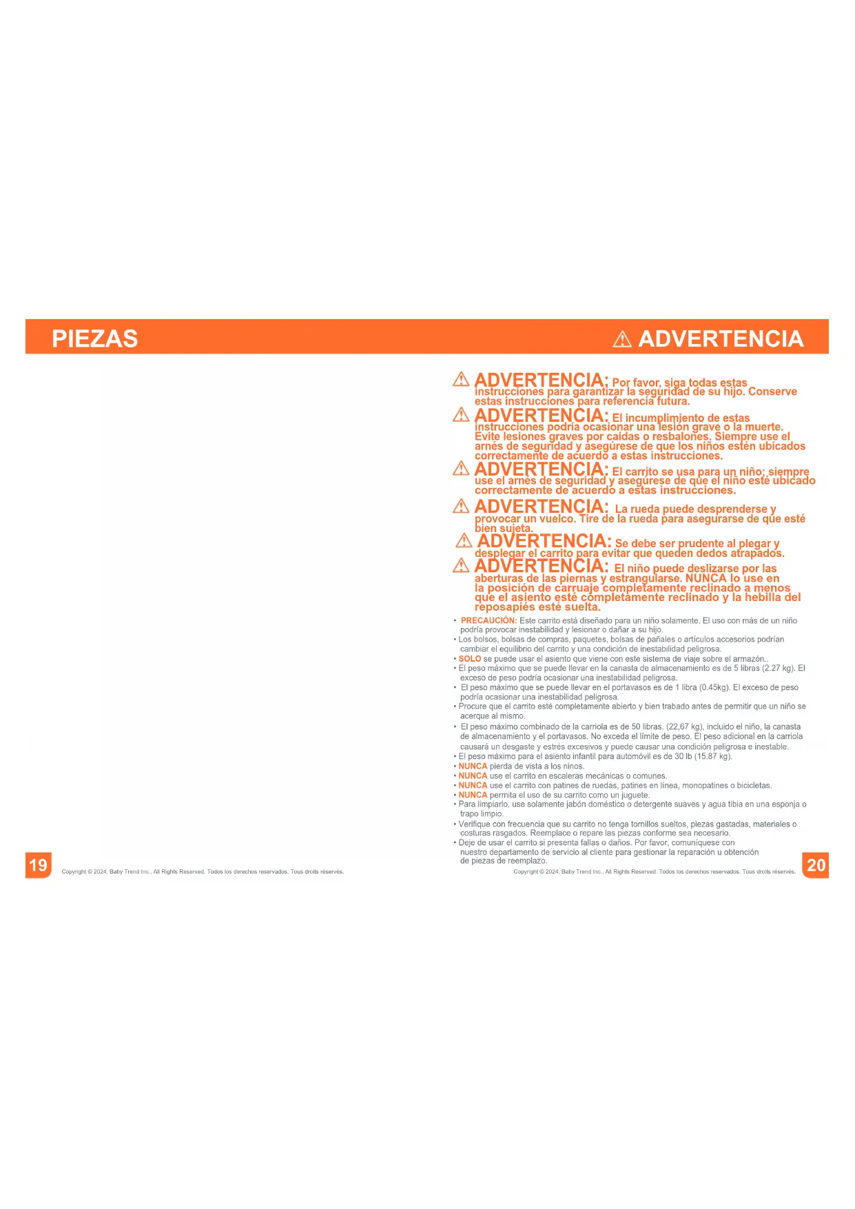 Copyright © 2024, Baby Trend Inc., All Rights Reserved. Todos los derechos reservados. Tous droits réservés. ADVERTENCIA: Por favor, siga todas estas instrucciones para garantizar la seguridad de su hijo. Conserve estas instrucciones para referencia futura. ADVERTENCIA: El incumplimiento de estas instrucciones podría ocasionar una lesión grave o la muerte. Evite lesiones graves por caídas o resbalones. Siempre use el arnés de seguridad y asegúrese de que los niños estén ubicados correctamente de acuerdo a estas instrucciones. ADVERTENCIA: El carrito se usa para un niño; siempre use el arnés de seguridad y asegúrese de que el niño esté ubicado correctamente de acuerdo a estas instrucciones.