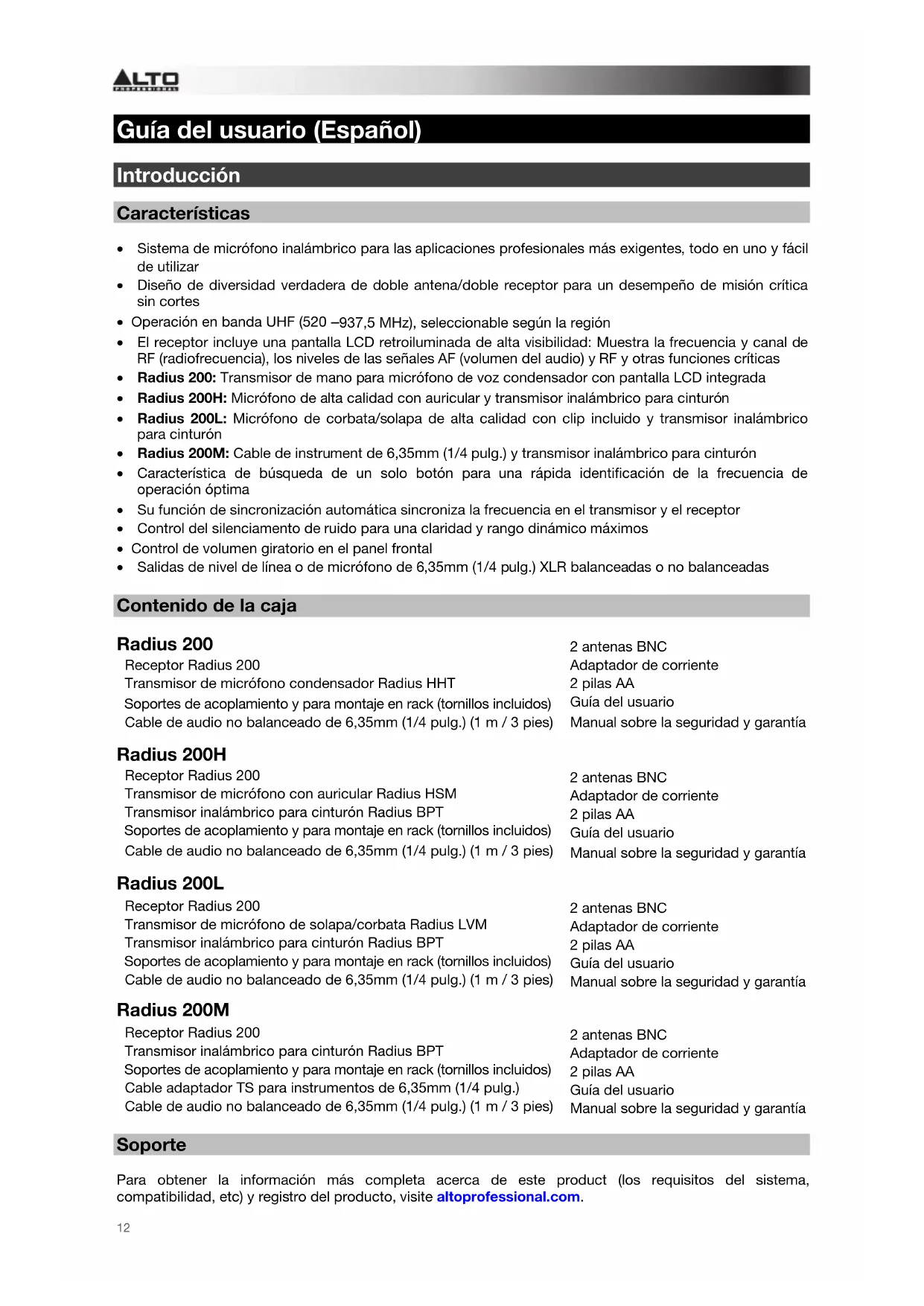- Salidas de nivel de línea o de micrófono de 6,35mm (1/4 pulg.) XLR balanceadas o no balanceadas Contenido de la caja Radius 200 Receptor Radius 200 Transmisor de micrófono condensador Radius HHT Soportes de acoplamiento y para montaje en rack (tornillos incluidos) Cable de audio no balanceado de 6,35mm (1/4 pulg.) (1 m / 3 pies) 2 antenas BNC Adaptador de corriente 2 pilas AA Guía del usuario Manual sobre la seguridad y garantía Radius 200H Receptor Radius 200 Transmisor de micrófono con auricular Radius HSM Transmisor inalámbrico para cinturón Radius BPT Soportes de acoplamiento y para montaje en rack (tornillos incluidos) Cable de audio no balanceado de 6,35mm (1/4 pulg.) (1 m / 3 pies)