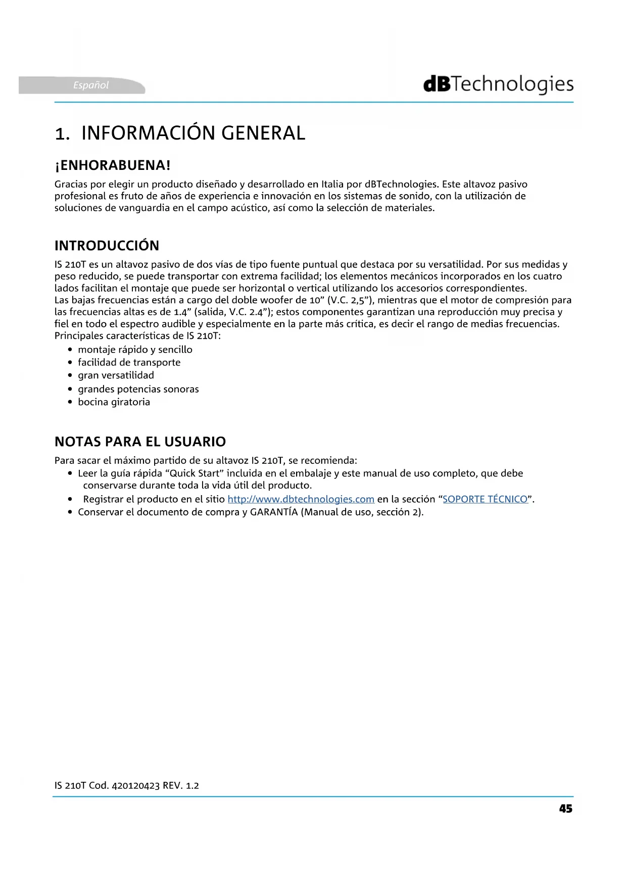 Encuentra gratis el manual del aparato IS210T DB Technologies en formato PDF.