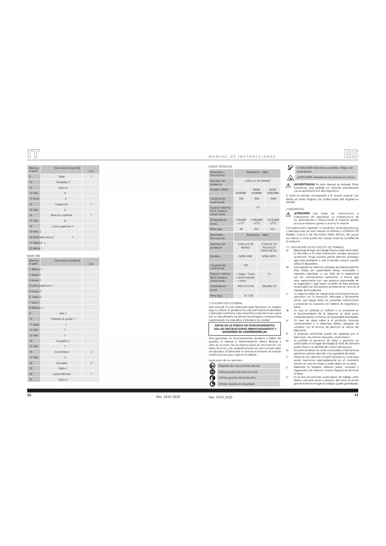 Rev. 24.01.2020 Rev. 24.01.2020 Numero di parti Descrizione Quantità / pz. 1 Albero 1 2 Molla 1 3 Perno 1 4 Lama superiore 1 5 Corpo 1 6 Dado 2 7 Leva 1 8 Manico 1 9 Vite 2 10 Piastrina di spinta 1 11 Stelo 1 12 Vite 1 13 Vite 1 14 Rondella 2 15 Vite 1 16 Connettore 2 17 Vite 3 18 Rondella 3 19 Dado 1 20 Lama inferiore 1 21 Dado 2 MSW-HS8 Numero di parti Descrizione Quantità / pz. 9 Stelo 1 10 Rondella 2 11 Dado 4 12 Vite 4 13 Stelo 2 14 Coperchio 1 15 Vite 4 16 Braccio superiore 1 17 Vite 4 18 Lama superiore 1 19 Vite 2 20 Rullo del manico 1 21 Manico 1 22 Molla 1 Para garantizar un funcionamiento duradero y able del aparato, el manejo y mantenimiento deben llevarse a cabo de acuerdo con las instrucciones de este manual. Los datos técnicos y las especicaciones de este manual están actualizados. El fabricante se reserva el derecho de realizar modicaciones para mejorar la calidad. Explicación de los símbolos