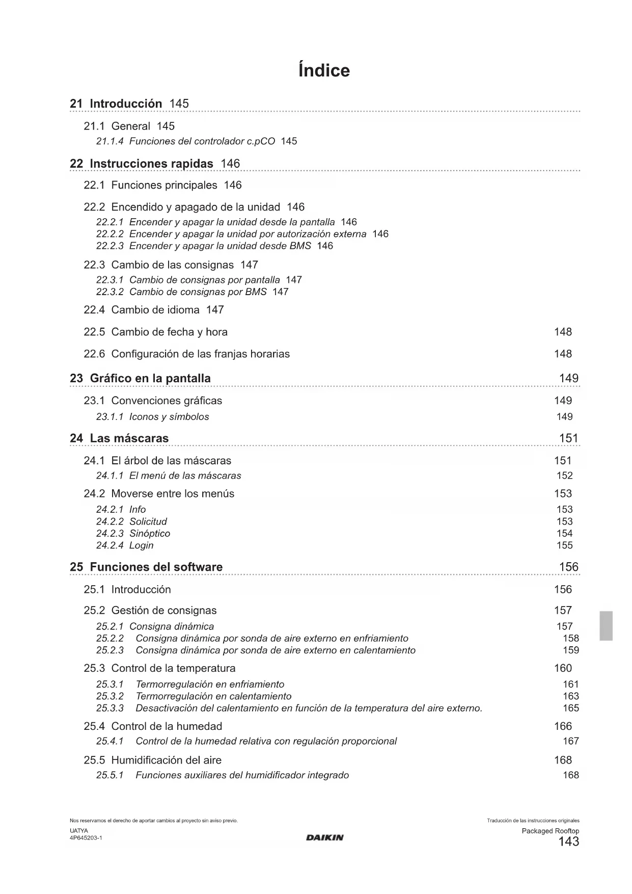 En el controlador se ha cargado un software especial para la gestión de las unidades. El software consta de un conjunto de funciones dedicadas a las condiciones de funcionamiento previstas para las unidades. En los próximos capítulos se describen todas las funciones gestionadas por el software, desde las más comunes que están presentes en todas las unidades hasta aquellas dedicadas a versiones o modelos especícos. Algunas funciones aquí descritas podrían estar disponibles solamente en versiones o tamaños especícos, o bien según los accesorios seleccionados. En la descripción de las distintas funciones, se da por hecho el conocimiento del usuario sobre el funcionamiento de las unidades y de sus respectivos circuitos hidráulicos o frigorícos. Todas las descripciones, las conguraciones y los parámetros indicados se reeren a unidades instaladas correctamente según dispuesto en la documentación correspondiente.Traducción de las instrucciones originalesPackaged Rooftop Nos reservamos el derecho de aportar cambios al proyecto sin aviso previo.UATYA4P645203-1