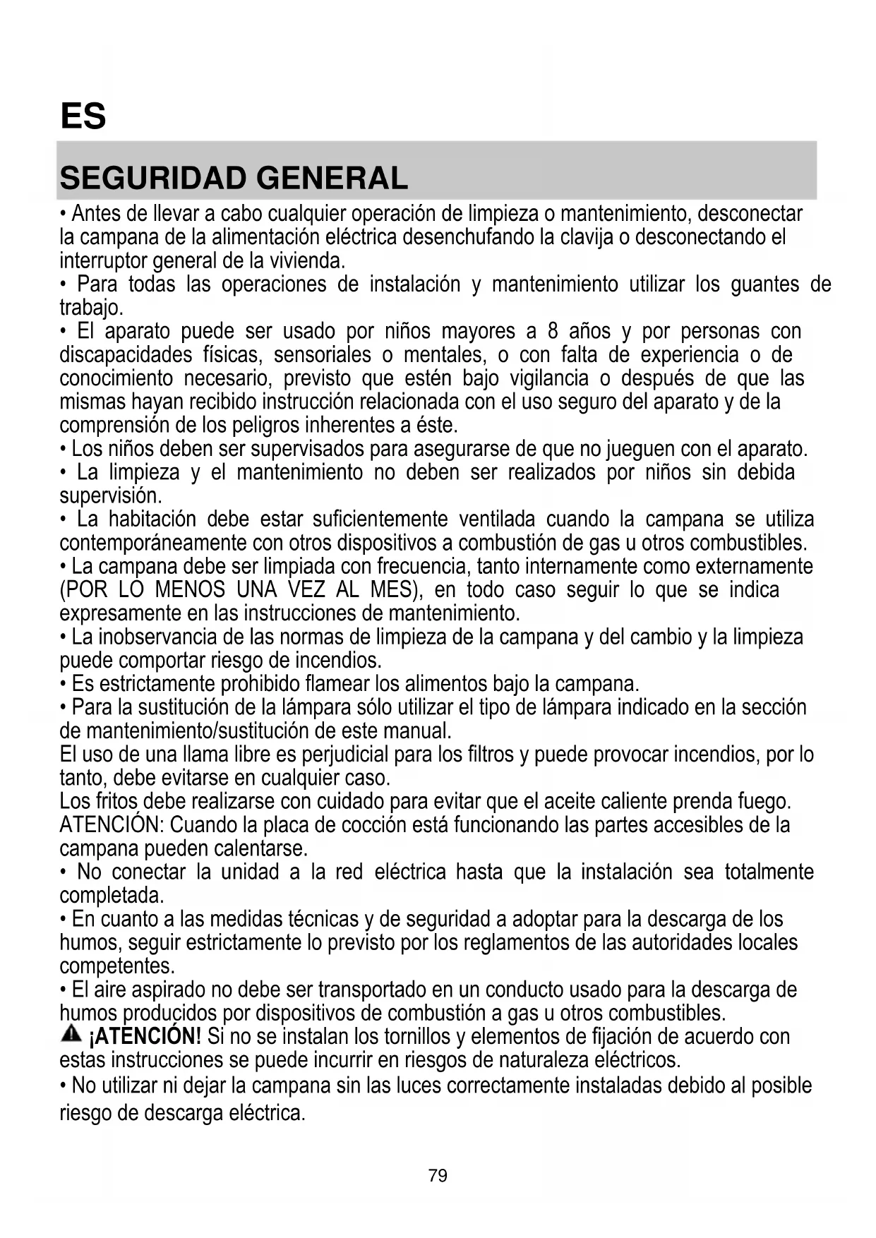 - Para la sustitución de la lámpara sólo utilizar el tipo de lámpara indicado en la sección de mantenimiento/sustitución de este manual. El uso de una llama libre es perjudicial para los filtros y puede provocar incendios, por lo tanto, debe evitarse en cualquier caso. Los fritos debe realizarse con cuidado para evitar que el aceite caliente prenda fuego. ATENCIÓN: Cuando la placa de cocción está funcionando las partes accesibles de la campana pueden calentarse.