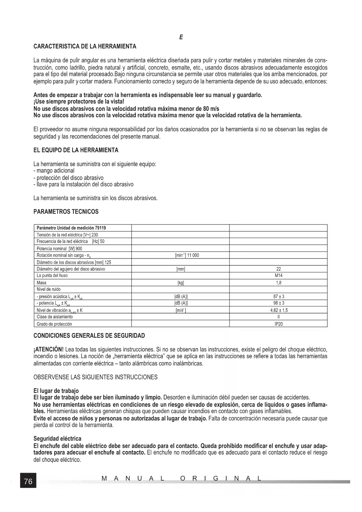 La herramienta se suministra con el siguiente equipo: - mango adicional - protección del disco abrasivo - llave para la instalación del disco abrasivo La herramienta se suministra sin los discos abrasivos. PARAMETROS TECNICOS Parámetro Unidad de medición 79119 Tensión de la red eléctrica [V~] 230 Frecuencia de la red eléctrica [Hz] 50 Potencia nominal [W] 900 Rotación nominal sin carga - n