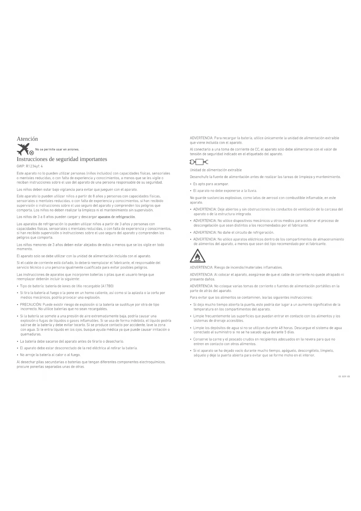 La función de Bluetooth se apagará después de 12 horas sin estar activa.ES 4443 ES Especificaciones Capacidad de almacenamiento 53L Capacidad 299Wh Tensión de entrada de CA 100V-240V, 50Hz/60Hz Potencia de entrada de CA 95W Max Entrada de CC 5,5A(12V)/ 2,5A(24V) Refrigerante R1234yf Dimensiones 852 x 430 x 487mm Peso neto 25,3kg (55,78lb) Rango de temperatura en la nevera -20 ~ 20° C / -4~68° F Rango de temperatura de funcionamiento