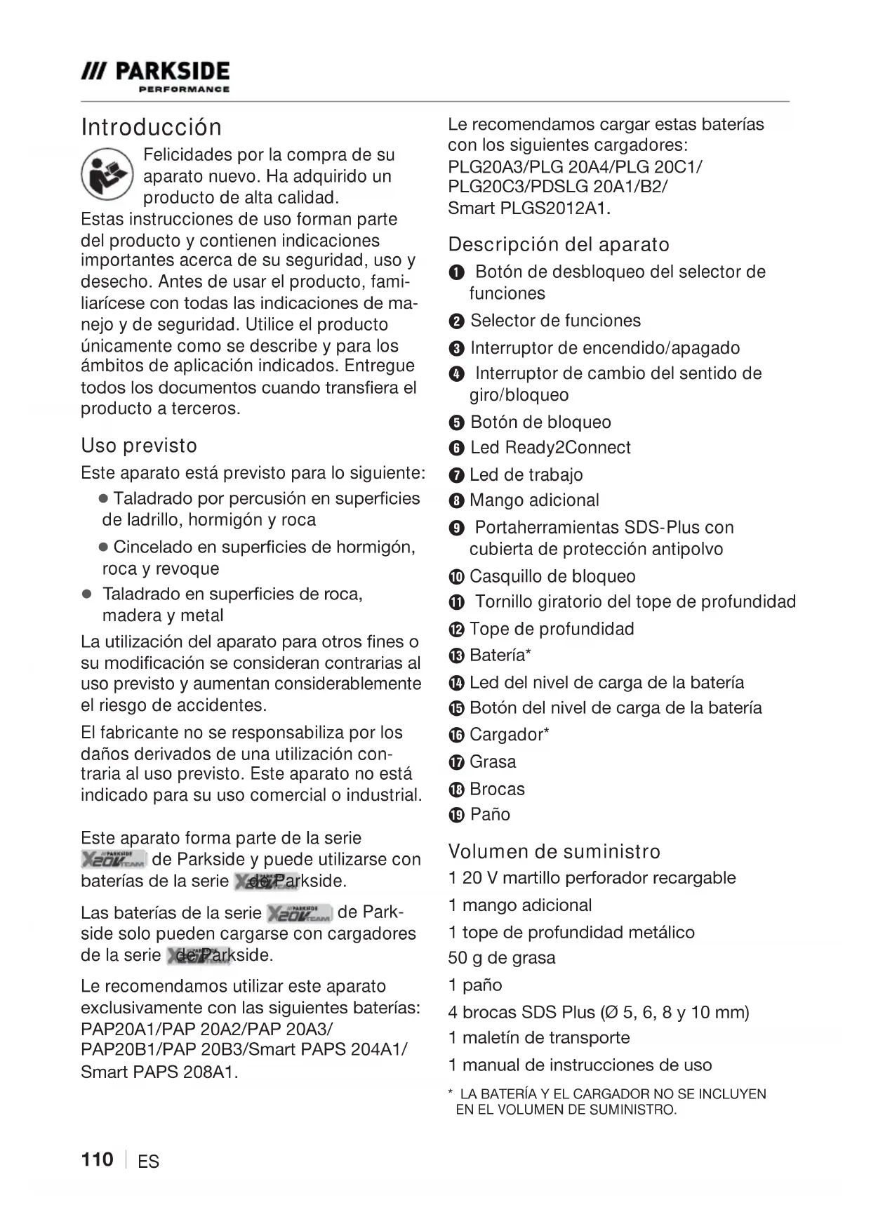 ֺES Introducción Felicidades por la compra de su aparato nuevo. Ha adquirido un producto de alta calidad. Estas instrucciones de uso forman parte del producto y contienen indicaciones importantes acerca de su seguridad, uso y desecho. Antes de usar el producto, fami- OLDUķFHVHFRQWRGDVODVLQGLFDFLRQHVGHPD- nejo y de seguridad. Utilice el producto únicamente como se describe y para los ámbitos de aplicación indicados. Entregue WRGRVORVGRFXPHQWRVFXDQGRWUDQVƞHUDHO producto a terceros. Uso previsto Este aparato está previsto para lo siguiente: ▯ 7DODGUDGRSRUSHUFXVLŒQHQVXSHUƞFLHV de ladrillo, hormigón y roca ▯ &LQFHODGRHQVXSHUƞFLHVGHKRUPLJŒQ roca y revoque ▯ 7DODGUDGRHQVXSHUƞFLHVGHURFD madera y metal /DXWLOL]DFLŒQGHODSDUDWRSDUDRWURVƞQHVR VXPRGLƞFDFLŒQVHFRQVLGHUDQFRQWUDULDVDO uso previsto y aumentan considerablemente el riesgo de accidentes. El fabricante no se responsabiliza por los daños derivados de una utilización con- traria al uso previsto. Este aparato no está indicado para su uso comercial o industrial. Este aparato forma parte de la serie de Parkside y puede utilizarse con EDWHUķDVGHODVHULH de Parkside. /DVEDWHUķDVGHODVHULH de Park- side solo pueden cargarse con cargadores de la serie de Parkside. Le recomendamos utilizar este aparato H[FOXVLYDPHQWHFRQODVVLJXLHQWHVEDWHUķDV 3$3ּּ$3$3ּּ$3$3ּּ$ 3$3ּּ%3$3ּּ%6PDUW3$36ּּ$ 6PDUW3$36ּּ$. /HUHFRPHQGDPRVFDUJDUHVWDVEDWHUķDV con los siguientes cargadores: 3/*ּּ$3/*ּּ$3/*ּּ& 3/*ּּ&3'6/*ּּ$% 6PDUWּ3/*6ּּ$ Descripción del aparato 1 Botón de desbloqueo del selector de funciones 2 Selector de funciones 3 Interruptor de encendido/apagado 4 Interruptor de cambio del sentido de giro/bloqueo 5 Botón de bloqueo 6 Led Ready2Connect 7 Led de trabajo 8 Mango adicional 9 Portaherramientas SDS-Plus con cubierta de protección antipolvo 0 Casquillo de bloqueo q Tornillo giratorio del tope de profundidad w Tope de profundidad e %DWHUķD r /HGGHOQLYHOGHFDUJDGHODEDWHUķD t %RWŒQGHOQLYHOGHFDUJDGHODEDWHUķD z Cargador* u Grasa i Brocas o Paño Volumen de suministro ּ9PDUWLOORSHUIRUDGRUUHFDUJDEOH ּPDQJRDGLFLRQDO ּWRSHGHSURIXQGLGDGPHWûOLFR ּJGHJUDVD ּSDőR