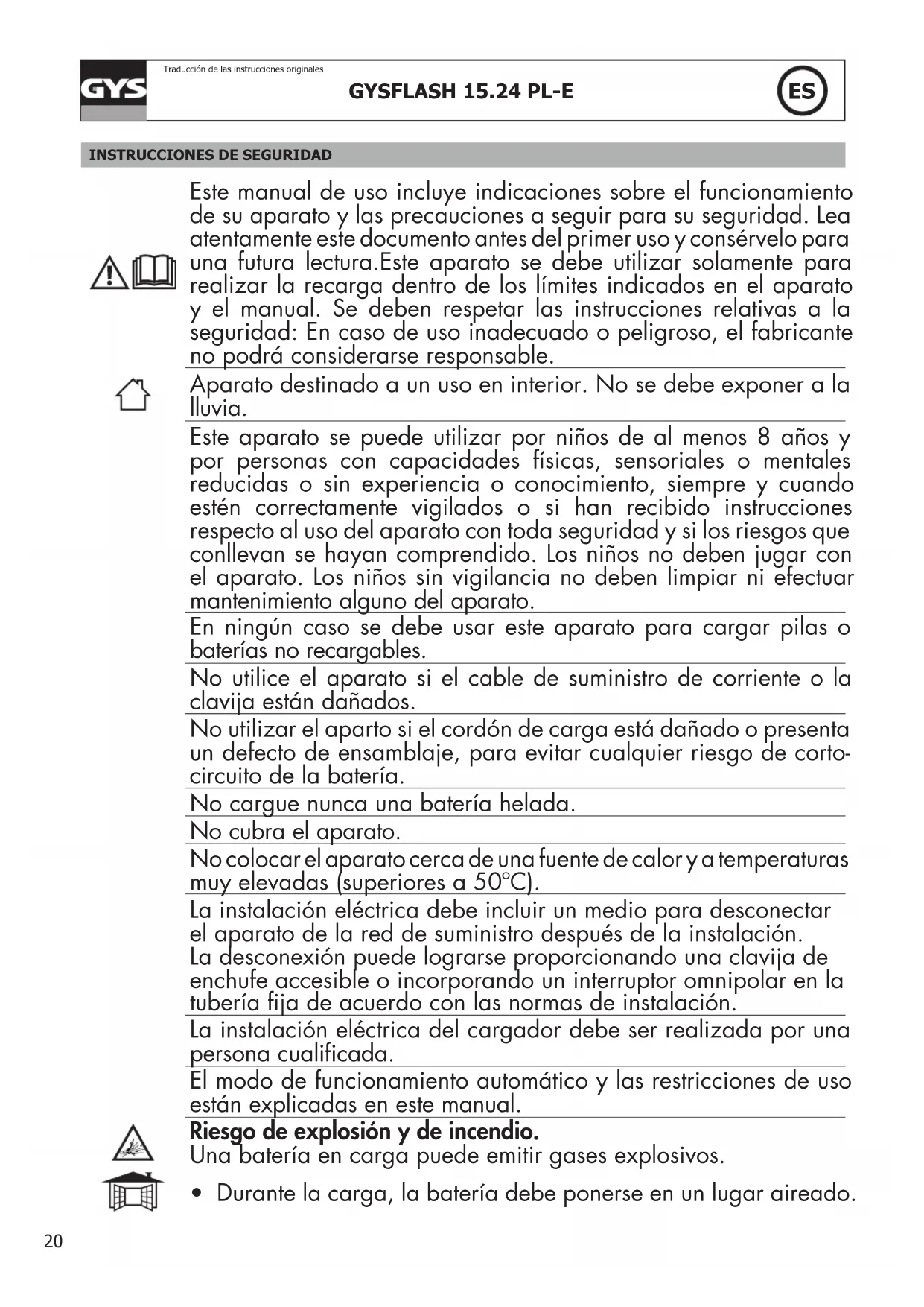 Übersetzung der OriginalbetriebsanleitungINSTRUCCIONES DE SEGURIDAD Este manual de uso incluye indicaciones sobre el funcionamiento de su aparato y las precauciones a seguir para su seguridad. Lea atentamente este documento antes del primer uso y consérvelo para una futura lectura.Este aparato se debe utilizar solamente para realizar la recarga dentro de los límites indicados en el aparato y el manual. Se deben respetar las instrucciones relativas a la seguridad: En caso de uso inadecuado o peligroso, el fabricante no podrá considerarse responsable. Aparato destinado a un uso en interior. No se debe exponer a la lluvia. Este aparato se puede utilizar por niños de al menos 8 años y por personas con capacidades físicas, sensoriales o mentales reducidas o sin experiencia o conocimiento, siempre y cuando estén correctamente vigilados o si han recibido instrucciones respecto al uso del aparato con toda seguridad y si los riesgos que conllevan se hayan comprendido. Los niños no deben jugar con el aparato. Los niños sin vigilancia no deben limpiar ni efectuar mantenimiento alguno del aparato. En ningún caso se debe usar este aparato para cargar pilas o baterías no recargables. No utilice el aparato si el cable de suministro de corriente o la clavija están dañados. No utilizar el aparto si el cordón de carga está dañado o presenta un defecto de ensamblaje, para evitar cualquier riesgo de corto- circuito de la batería. No cargue nunca una batería helada. No cubra el aparato. No colocar el aparato cerca de una fuente de calor y a temperaturas muy elevadas (superiores a 50ºC). La instalación eléctrica debe incluir un medio para desconectar el aparato de la red de suministro después de la instalación. La desconexión puede lograrse proporcionando una clavija de enchufe accesible o incorporando un interruptor omnipolar en la tubería ja de acuerdo con las normas de instalación. La instalación eléctrica del cargador debe ser realizada por una persona cualicada. El modo de funcionamiento automático y las restricciones de uso están explicadas en este manual. Riesgo de explosión y de incendio. Una batería en carga puede emitir gases explosivos.