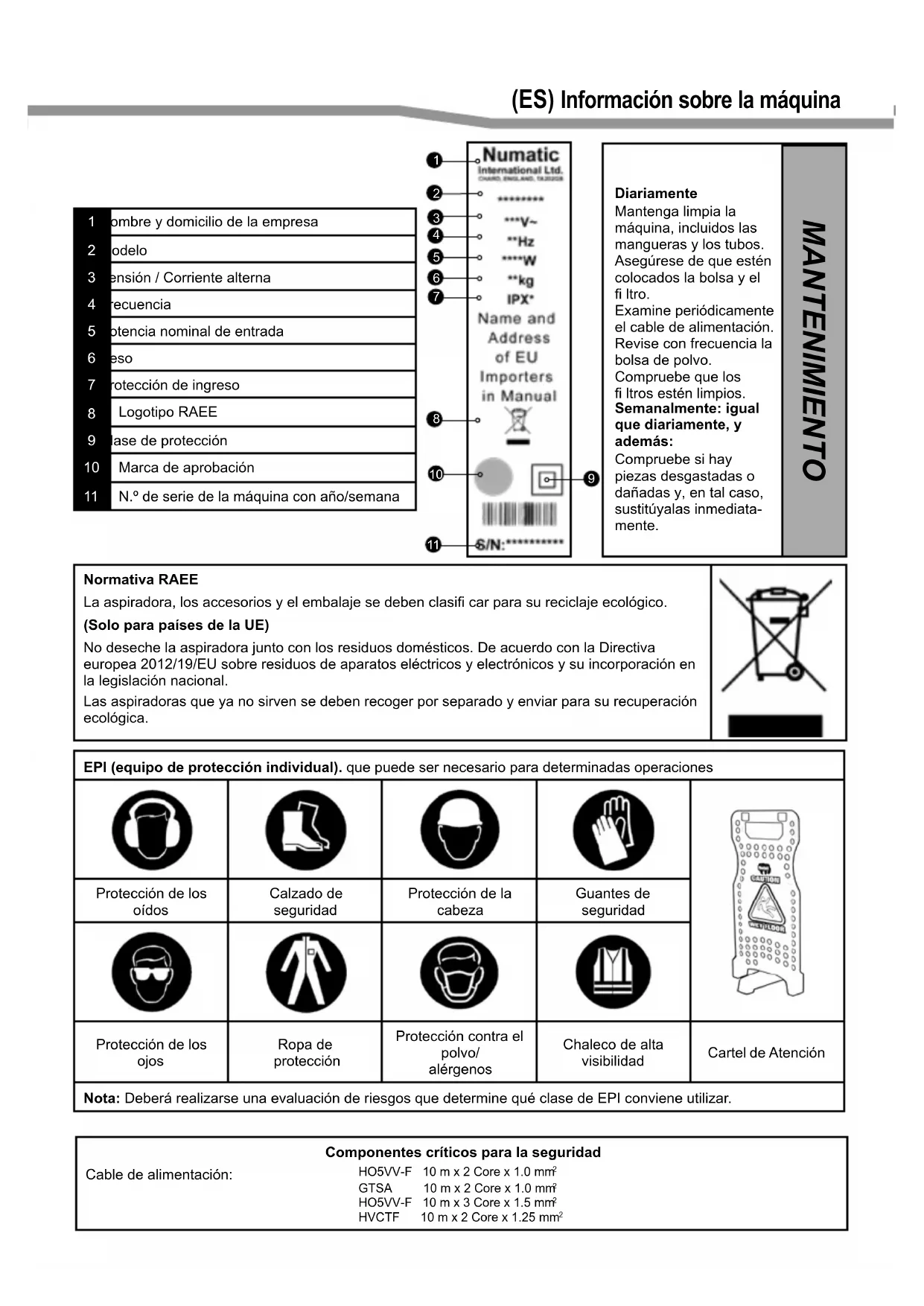 | Normativa RAEE La aspiradora, los accesos y el embalaje se deben clasifi car para su reciclaje ecologico. (Solo para páízes de la UE) No desechec la aspiradora jusqu con los residuos domesticos. De acuerdo con la Direcita europea 2012/19/EU sobre residuos de aparatos electricos y electrónicos y su incorpociación en la legislación nacional. Las aspiradoras que ya no sirven se deben recoger por分开ado y enviar para su recuperación ecológica. | Diariamente Mantenga limpia la máquina, incluidos las mangueras y los tubos. Asegürese de que estén colocados la Bolsa y el fi ltro. Examine periodically el cable de alimentación. Revise con fecundía la bolsa de polvo. Compruebe que los fi ltros estén limpios. Semanamente: igual que diariamente, y adernás: Compruebe si hay piezas desgastadas o dañadas y, en tal caso, sustitúylas inmediata- mente. | |||