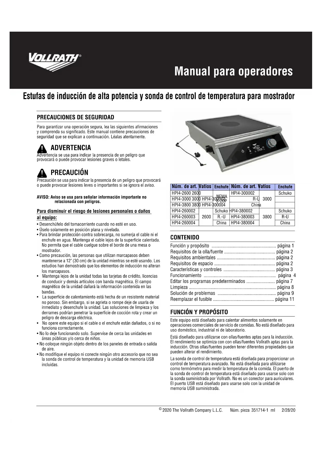 Este equipo está diseñado para calentar alimentos solamente en operaciones comerciales de servicio de comidas. No está diseñado para uso doméstico, industrial ni de laboratorio. Está diseñado para utilizarse con ollas/fuentes aptas para la inducción. El rendimiento se optimiza con con ollas/fuentes Vollrath aptas para la inducción. Otras ollas/fuentes pueden tener diferentes propiedades que pueden alterar el rendimiento. La sonda de control de temperatura está diseñada para proporcionar un control de temperatura avanzado. No está diseñada para utilizarse como termómetro para medir la temperatura de la comida. El puerto de la sonda de control de temperatura está diseñado para usarse solo con la sonda suministrada por Vollrath. No es un conector para auriculares. El puerto USB está diseñado para usarse solo con la unidad de memoria USB suministrada. ADVERTENCIA PRECAUCIÓN Núm. de art. Vatios Enchufe Núm. de art. Vatios EnchufeHPI4-2600 2600NEMA 6-20PHPI4-300002 SchukoHPI4-3000 3000 HPI4-300003 R-UHPI4-3800 3800 HPI4-300004 ChinaHPI4-260002 Schuko HPI4-380002 SchukoHPI4-260003 R.-U HPI4-380003 R-UHPI4-260004 China HPI4-380004 China2 Manual para operadores de estufas de inducción de alta potencia y sonda de control de temperatura para mostrador