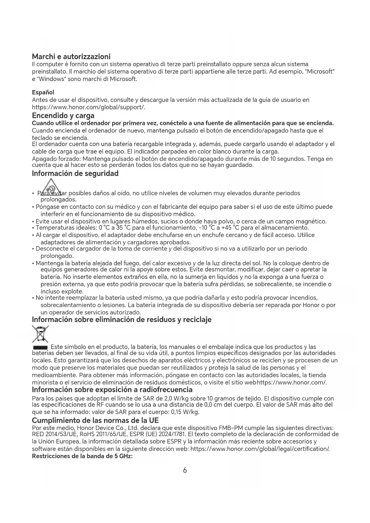Potenza e bande di frequenza Bluetooth 2.4GHz:20dBm,Wi-Fi 2.4GHz:20dBm,Wi-Fi 5G:5150-5250MHz:23dBm, 5250-5350MHz:23dBm,5470-5725MHz:23dBm,5725-5850MHz:14dBm 5Marchi e autorizzazioni Il computer è fornito con un sistema operativo di terze pai preinstallato oppure senza alcun sistema preinstallato. Il marchio del sistema operativo di terze pai appaiene alle terze pai. Ad esempio, "Microsoft" e "Windows" sono marchi di Microsoft. Español Antes de usar el dispositivo, consulte y descargue la versión más actualizada de la guía de usuario en https://www.honor.com/global/suppo/. Encendido y carga Cuando utilice el ordenador por primera vez, conéctelo a una fuente de alimentación para que se encienda. Cuando encienda el ordenador de nuevo, mantenga pulsado el botón de encendido/apagado hasta que el teclado se encienda. El ordenador cuenta con una batería recargable integrada y, además, puede cargarlo usando el adaptador y el cable de carga que trae el equipo. El indicador parpadea en color blanco durante la carga. Apagado forzado: Mantenga pulsado el botón de encendido/apagado durante más de 10 segundos. Tenga en cuenta que al hacer esto se perderán todos los datos que no se hayan guardado. Información de seguridad