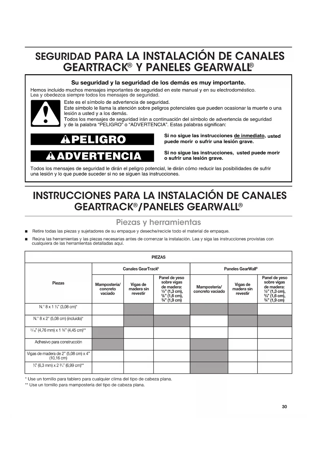 Si no sigue las instrucciones de inmediato, usted o sufrir una lesión grave.Si no sigue las instrucciones, usted puede morir o sufrir una lesión grave.Todos los mensajes de seguridad le dirán el peligro potencial, le dirán cómo reducir las posibilidades de sufriruna lesión y lo que puede suceder si no se siguen las instrucciones.Su seguridad y la seguridad de los demás es muy importante.Hemos incluido muchos mensajes importantes de seguridad en este manual y en su electrodoméstico.Este es el símbolo de advertencia de seguridad.Este símbolo le llama la atención sobre peligros potenciales que pueden ocasionar la muerte o una y de la palabra “PELIGRO” o “ADVERTENCIA”. Estas palabras significan: PELIGRO ADVERTENCIA a usted y a los demás.Lea y obedezca siempre todos los mensajes de seguridad.Todos los mensajes de seguridad irán a continuación del símbolo de advertencia de seguridad puede morir lesión PIEZASPiezasCanales GearTrack Paneles GearWall Mampostería/concreto vaciadoVigas de madera sin revestirPanel de yeso sobre vigas de madera: ½”(1,3cm),