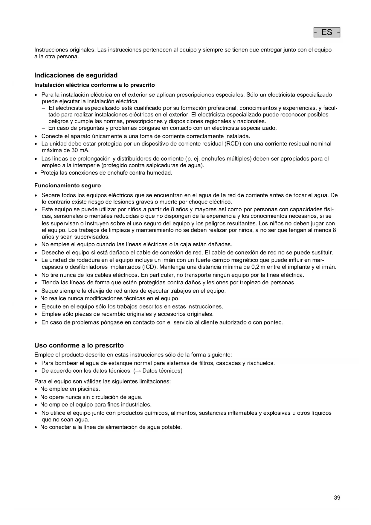 - ES - Instrucciones originales. Las instrucciones pertenecen al equipo y siempre se tienen que entregar junto con el equipo a la otra persona. Indicaciones de seguridad Instalación eléctrica conforme a lo prescrito
