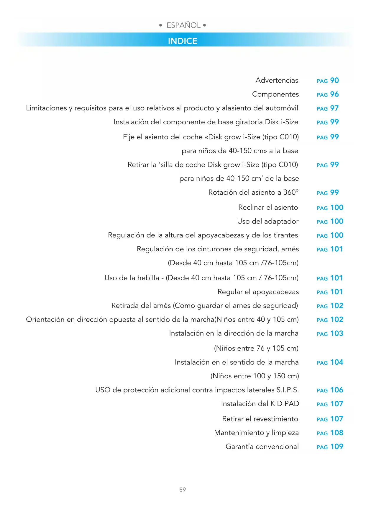 INDICE pag 90 pag 96 pag 97 pag 99 pag 99 pag 99 pag 99 pag 100 pag 100 pag 100 pag 101 pag 101 pag 101 pag 102 pag 102 pag 103 pag 104 pag 106 pag 107 pag 107 pag 108 pag 109 Advertencias Componentes Limitaciones y requisitos para el uso relativos al producto y alasiento del automóvil Instalación del componente de base giratoria Disk i-Size Fije el asiento del coche «Disk grow i-Size (tipo C010) para niños de 40-150 cm» a la base Retirar la ‘silla de coche Disk grow i-Size (tipo C010) para niños de 40-150 cm’ de la base Rotación del asiento a 360° Reclinar el asiento Uso del adaptador Regulación de la altura del apoyacabezas y de los tirantes Regulación de los cinturones de seguridad, arnés (Desde 40 cm hasta 105 cm /76-105cm) Uso de la hebilla - (Desde 40 cm hasta 105 cm / 76-105cm) Regular el apoyacabezas Retirada del arnés (Como guardar el arnes de seguridad) Orientación en dirección opuesta al sentido de la marcha(Niños entre 40 y 105 cm) Instalación en la dirección de la marcha (Niños entre 76 y 105 cm) Instalación en el sentido de la marcha (Niños entre 100 y 150 cm) USO de protección adicional contra impactos laterales S.I.P.S. Instalación del KID PAD Retirar el revestimiento Mantenimiento y limpieza Garantía convencional• ESPAÑOL • • ESPAÑOL •