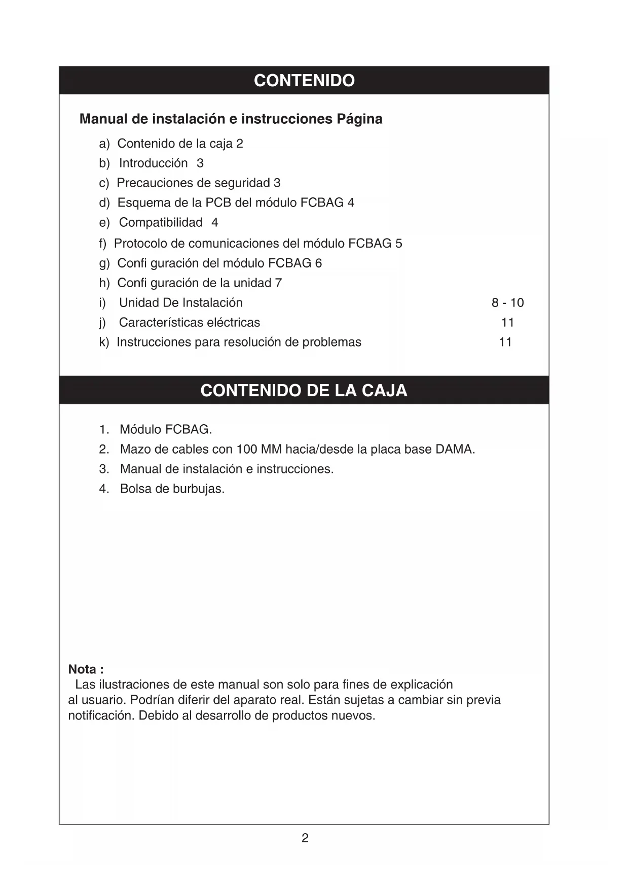Verkeerde instelling van DIP_Confi g van het moederbord Knippert Knippert niet Zorg ervoor dat alleen dip-switch 'E' voor de MODBUS-functie AAN is. ** Zie de lay-out van de FCBAG-module voor de plaats van de leds. IOM_FCBAG MODULE_3P764166-1-KC_EN+ML.indb 11IOM_FCBAG MODULE_3P764166-1-KC_EN+ML.indb 11 18/10/2024 2:00:17 PM18/10/2024 2:00:17 PM2 Nota : Las ilustraciones de este manual son solo para fines de explicación al usuario. Podrían diferir del aparato real. Están sujetas a cambiar sin previa notificación. Debido al desarrollo de productos nuevos. CONTENIDO Manual de instalación e instrucciones Página a) Contenido de la caja 2 b) Introducción 3 c) Precauciones de seguridad 3 d) Esquema de la PCB del módulo FCBAG 4 e) Compatibilidad 4 f) Protocolo de comunicaciones del módulo FCBAG 5 g) Confi guración del módulo FCBAG 6 h) Confi guración de la unidad 7