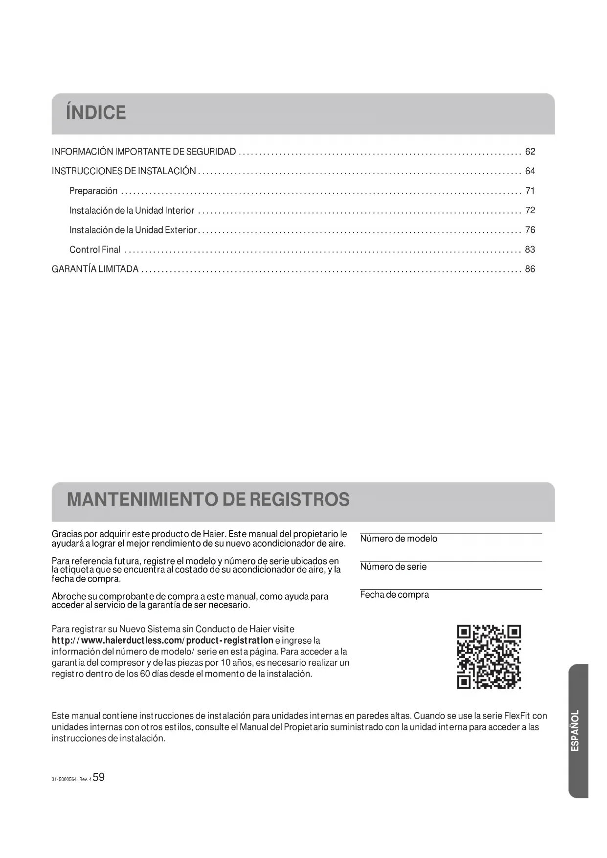 Fecha de compra Este manual contiene instrucciones de instalación para unidades internas en paredes altas. Cuando se use la serie FlexFit con unidades internas con otros estilos, consulte el Manual del Propietario suministrado con la unidad interna para acceder a las instrucciones de instalación. Para registrar su Nuevo Sistema sin Conducto de Haier visite http://www.haierductless.com/product-registration e ingrese la información del número de modelo/ serie en esta página. Para acceder a la garantía del compresor y de las piezas por 10 años, es necesario realizar un registro dentro de los 60 días desde el momento de la instalación.