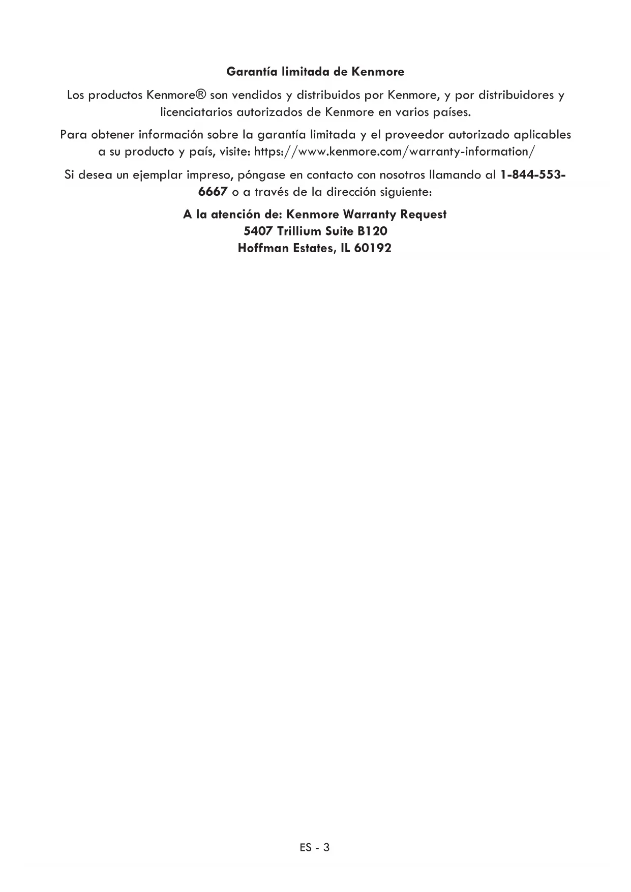 Garantía limitada de Kenmore Los productos Kenmore® son vendidos y distribuidos por Kenmore, y por distribuidores y licenciatarios autorizados de Kenmore en varios países. Para obtener información sobre la garantía limitada y el proveedor autorizado aplicables a su producto y país, visite: https://www.kenmore.com/warranty-information/ Si desea un ejemplar impreso, póngase en contacto con nosotros llamando al 1-844-553- 6667 o a través de la dirección siguiente: A la atención de: Kenmore Warranty Request 5407 Trillium Suite B120 Hoffman Estates, IL 60192ES - 4 Gracias por seleccionar este producto. Este manual de uso contiene información importante sobre la seguridad, así como instrucciones para ayudarle a utilizar y mantener el electrodoméstico. Lea detenidamente este manual de uso antes de utilizar el electrodoméstico y consérvelo para su consulta futura. Icono Tipo Signicado ADVERTENCIA Riesgo de lesiones graves o muerte. RIESGO DE DESCARGA ELÉCTRICA Riesgo de tensión peligrosa FUEGO Advertencia: Riesgo de incendio/materiales inamables PRECAUCIÓN Riesgo de lesiones o daño a la propiedad NOTA IMPORTANTE Uso correcto del sistemaES - 5 INTRODUCCIÓN Lea este manual de instrucciones de seguridad, especial- mente las indicaciones de seguridad de forma completa y detenida. Le ahorrarán tiempo y esfuerzos, y le ayudarán a garantizar un óptimo rendimiento del lavavajillas. Asegúrese de observar todas las advertencias y precau- ciones indicadas. Esté especialmente atento a los iconos con marcas de exclamación. El icono de información proporcio- nará referencias importantes. ADVERTENCIA: Indica una situación potencialmente peligrosa que, de no evitarse, puede dar como resultado la muerte o lesiones graves. PRECAUCIÓN: Indica una situación potencialmente peligrosa que, de no evitarse, puede dar como resultado lesiones. También puede usarse para avisar de prácticas no seguras. AVISO: Indica una situación potencialmente peligrosa que, de no evitarse, puede dar lugar a daños en el lavavaji- llas, la vajilla, los equipos y el entorno.ES - 6