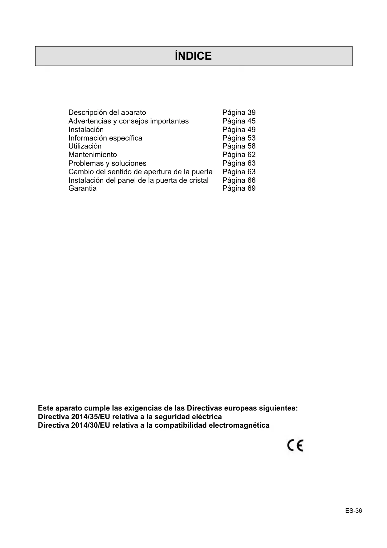 Garantia Página 39 Página 45 Página 49 Página 53 Página 58 Página 62 Página 63 Página 63 Página 66 Página 69 Este aparato cumple las exigencias de las Directivas europeas siguientes: Directiva 2014/35/EU relativa a la seguridad eléctrica Directiva 2014/30/EU relativa a la compatibilidad electromagnéticaES-37