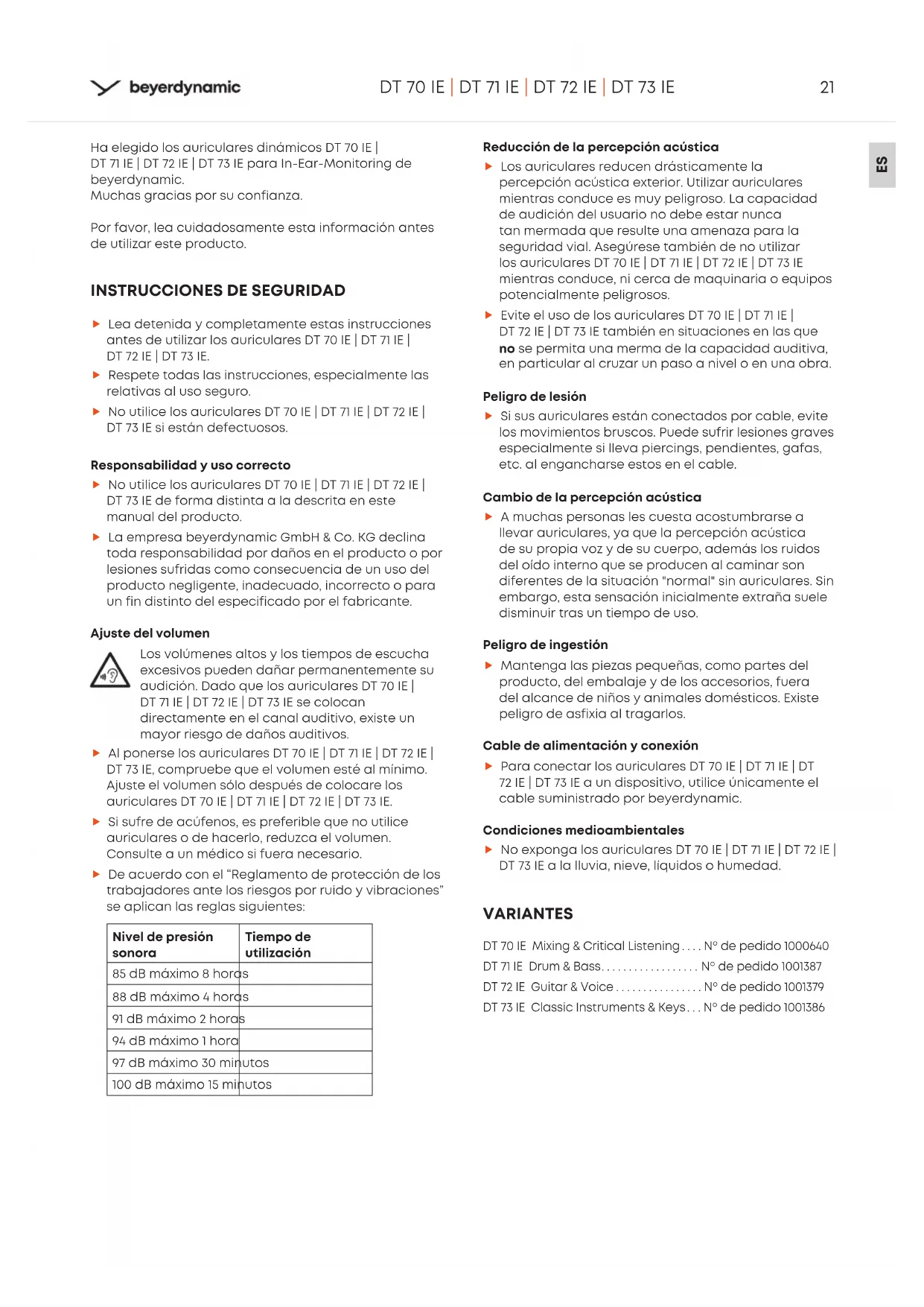 Lea detenida y completamente eas inrucciones antes de utilizar los auriculares DT 70 IE | DT 71 IE | DT 72 IE | DT 73 IE. Respete todas las inrucciones, especialmente las relativas al uso seguro. No utilice los auriculares DT 70 IE | DT 71 IE | DT 72 IE | DT 73 IE si eán defectuosos. Responsabilidad y uso correcto No utilice los auriculares DT 70 IE | DT 71 IE | DT 72 IE | DT 73 IE de forma diinta a la descrita en ee manual del producto. La empresa beyerdynamic GmbH & Co. KG declina toda responsabilidad por daños en el producto o por lesiones sufridas como consecuencia de un uso del producto negligente, inadecuado, incorrecto o para un fin diinto del especificado por el fabricante. Ajue del volumen Los volúmenes altos y los tiempos de escucha excesivos pueden dañar permanentemente su audición. Dado que los auriculares DT 70 IE | DT 71 IE | DT 72 IE | DT 73 IE se colocan directamente en el canal auditivo, exie un mayor riesgo de daños auditivos. Al ponerse los auriculares DT 70 IE | DT 71 IE | DT 72 IE | DT 73 IE, compruebe que el volumen eé al mínimo. Ajue el volumen sólo después de colocare los auriculares DT 70 IE | DT 71 IE | DT 72 IE | DT 73 IE. Si sufre de acúfenos, es preferible que no utilice auriculares o de hacerlo, reduzca el volumen. Consulte a un médico si fuera necesario. De acuerdo con el “Reglamento de protección de los trabajadores ante los riesgos por ruido y vibraciones” se aplican las reglas siguientes: Nivel de presión sonora Tiempo de utilización 85 dB máximo 8 horas 88 dB máximo 4 horas 91 dB máximo 2 horas 94 dB máximo 1 hora 97 dB máximo 30 minutos 100 dB máximo 15 minutos Reducción de la percepción acúica Los auriculares reducen dráicamente la percepción acúica exterior. Utilizar auriculares mientras conduce es muy peligroso. La capacidad de audición del usuario no debe ear nunca tan mermada que resulte una amenaza para la seguridad vial. Asegúrese también de no utilizar los auriculares DT 70 IE | DT 71 IE | DT 72 IE | DT 73 IE mientras conduce, ni cerca de maquinaria o equipos potencialmente peligrosos. Evite el uso de los auriculares DT 70 IE | DT 71 IE | DT 72 IE | DT 73 IE también en situaciones en las que no se permita una merma de la capacidad auditiva, en paicular al cruzar un paso a nivel o en una obra. Peligro de lesión Si sus auriculares eán conectados por cable, evite los movimientos bruscos. Puede sufrir lesiones graves especialmente si lleva piercings, pendientes, gafas, etc. al engancharse eos en el cable. Cambio de la percepción acúica A muchas personas les cuea acoumbrarse a llevar auriculares, ya que la percepción acúica de su propia voz y de su cuerpo, además los ruidos del oído interno que se producen al caminar son diferentes de la situación "normal" sin auriculares. Sin embargo, ea sensación inicialmente extraña suele disminuir tras un tiempo de uso. Peligro de ingeión Mantenga las piezas pequeñas, como paes del producto, del embalaje y de los accesorios, fuera del alcance de niños y animales doméicos. Exie peligro de asfixia al tragarlos. Cable de alimentación y conexión Para conectar los auriculares DT 70 IE | DT 71 IE | DT 72 IE | DT 73 IE a un dispositivo, utilice únicamente el cable suminirado por beyerdynamic. Condiciones medioambientales No exponga los auriculares DT 70 IE | DT 71 IE | DT 72 IE | DT 73 IE a la lluvia, nieve, líquidos o humedad. VARIANTES DT 70 IE Mixing & Critical Liening ....Nº de pedido 1000640 DT 71 IE Drum & Bass .................. Nº de pedido 1001387 DT 72 IE Guitar & Voice ................Nº de pedido 1001379 DT 73 IE Classic Inruments & Keys ...Nº de pedido 100138622