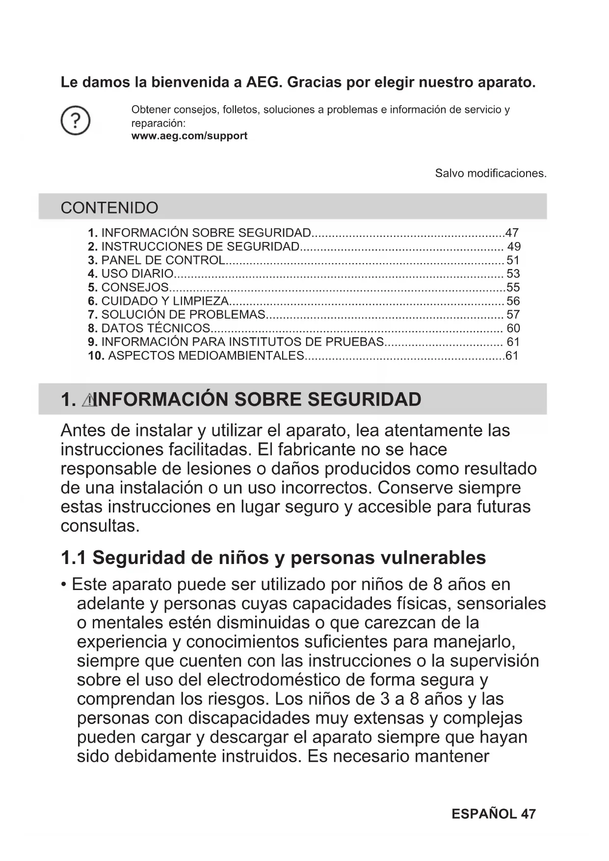 - Este aparato puede ser utilizado por niños de 8 años en adelante y personas cuyas capacidades físicas, sensoriales o mentales estén disminuidas o que carezcan de la experiencia y conocimientos suficientes para manejarlo, siempre que cuenten con las instrucciones o la supervisión sobre el uso del electrodoméstico de forma segura y comprendan los riesgos. Los niños de 3 a 8 años y las personas con discapacidades muy extensas y complejas pueden cargar y descargar el aparato siempre que hayan sido debidamente instruidos. Es necesario mantener ESPAÑOL 47alejados del aparato a los niños de menos de 3 años salvo que estén bajo supervisión continua.