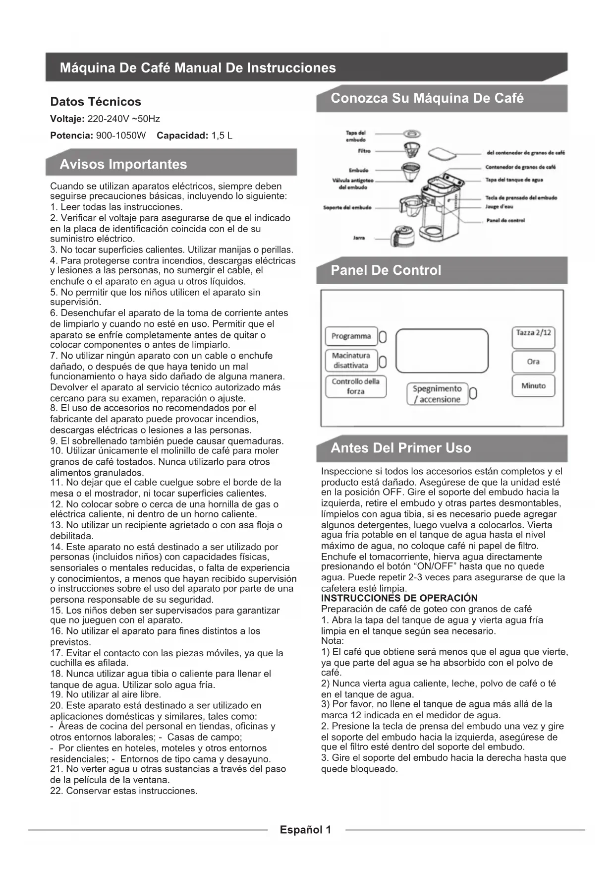 quede bloqueado. Panel De Control Antes Del Primer Uso Datos Técnicos Voltaje: 220-240V ~50Hz Potencia: 900-1050W Capacidad: 1,5 LEspañol 2