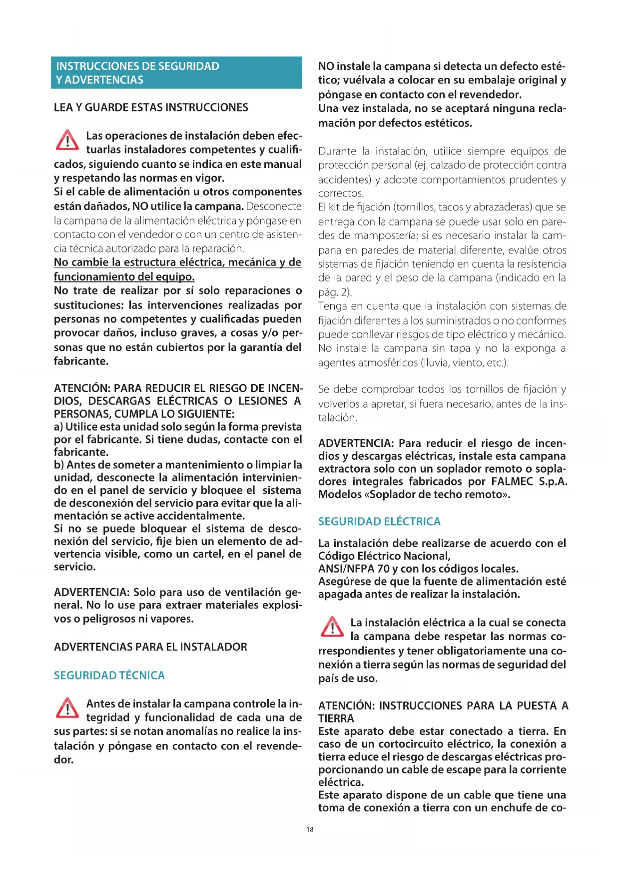 Antes de instalar la campana controle la in- tegridad y funcionalidad de cada una de sus partes: si se notan anomalías no realice la ins- talación y póngase en contacto con el revende- dor. NO instale la campana si detecta un defecto esté- tico; vuélvala a colocar en su embalaje original y póngase en contacto con el revendedor. Una vez instalada, no se aceptará ninguna recla- mación por defectos estéticos. Durante la instalación, utilice siempre equipos de protección personal (ej. calzado de protección contra accidentes) y adopte comportamientos prudentes y correctos. El kit de fijación (tornillos, tacos y abrazaderas) que se entrega con la campana se puede usar solo en pare- des de mampostería; si es necesario instalar la cam- pana en paredes de material diferente, evalúe otros sistemas de fijación teniendo en cuenta la resistencia de la pared y el peso de la campana (indicado en la pág. 2). Tenga en cuenta que la instalación con sistemas de fijación diferentes a los suministrados o no conformes puede conllevar riesgos de tipo eléctrico y mecánico. No instale la campana sin tapa y no la exponga a agentes atmosféricos (lluvia, viento, etc.). Se debe comprobar todos los tornillos de fijación y volverlos a apretar, si fuera necesario, antes de la ins- talación. ADVERTENCIA: Para reducir el riesgo de incen- dios y descargas eléctricas, instale esta campana extractora solo con un soplador remoto o sopla- dores integrales fabricados por FALMEC S.p.A. Modelos «Soplador de techo remoto».