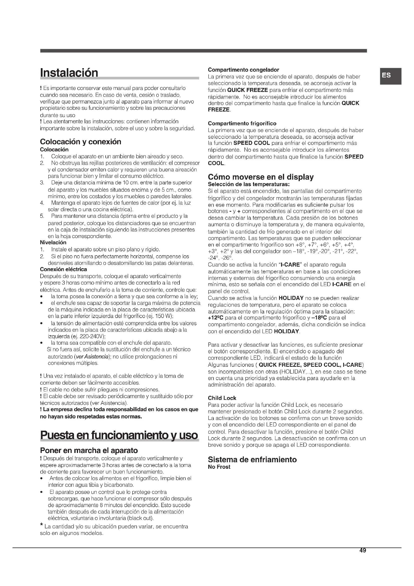 - Elaparatoposeeuncontrolqueloprotegecontra sobrecargas,quehacefuncionarelcompresorsólodespués deaproximadamente8minutosdelencendido.Estosucede tambiéndespuésdecadainterrupcióndelaalimentación eléctrica,voluntariaoinvoluntaria(blackout). Compartimento congelador Laprimeravezqueseenciendeelaparato,despuésdehaber seleccionadolatemperaturadeseada,seaconsejaactivarla funciónQUICK FREEZEparaenfriarelcompartimentomás rápidamente.Noesaconsejableintroducirlosalimentos dentrodelcompartimentohastaquefinalicelafunciónQUICK FREEZE. Compartimento frigorífico Laprimeravezqueseenciendeelaparato,despuésdehaber seleccionadolatemperaturadeseada,seaconsejaactivar lafunciónSPEED COOLparaenfriarelcompartimentomás rápidamente.Noesaconsejableintroducirlosalimentos dentrodelcompartimentohastaquefinalicelafunciónSPEED COOL. Cómo moverse en el display Selección de las temperaturas: Sielaparatoestáencendido,laspantallasdelcompartimento frigoríficoydelcongeladormostraránlastemperaturasfijadas enesemomento.Paramodificarlasessuficientepulsarlos botones- y+correspondientesalcompartimentoenelquese deseacambiarlatemperatura.Cadapresióndelosbotones aumentaodisminuyelatemperaturay,demaneraequivalente, tambiénlacantidaddefríogeneradoenelinteriordel compartimento.Lastemperaturasquesepuedenseleccionar enelcompartimentofrigoríficoson+8°,+7°,+6°,+5°,+4°, +3°,+2°ylasdelcongeladorson–18°,-19°,-20°,-21°,-22°, -24°,-26°. Cuandoseactivalafunción“I-CARE”elaparatoregula automáticamentelastemperaturasenbasealascondiciones internasyexternasdelfrigoríficoconsumiendounaenergía mínima,estoseseñalaconelencendidodelLEDI-CAREenel paneldecontrol. CuandoseactivalafunciónHOLIDAY nosepuedenrealizar regulacionesdetemperatura,peroelaparatosecoloca automáticamenteenlaregulaciónóptimaparalasituación: +12ºCparaelcompartimentofrigoríficoy–18ºCparael compartimentocongelador,además,dichacondiciónseindica conelencendidodelLEDHOLIDAY. Paraactivarydesactivarlasfunciones,essuficientepresionar elbotóncorrespondiente.Elencendidooapagadodel correspondienteLED,indicaráelestadodelafunción Algunasfunciones( QUICK FREEZE, SPEED COOL, I-CARE) sonincompatiblesconotras(HOLIDAY,..),enesecasosetiene encuentaunaprioridadyaestablecidaparaayudarleenla administracióndelaparato. Child Lock ParapoderactivarlafunciónChildLock,esnecesario mantenerpresionadoelbotónChildLockdurante2segundos. Laactivacióndelosbotonesseconfirmaconunbrevesonido yconelencendidodelLEDcorrespondienteenelpanelde control.Paradesactivarlafunción,presioneelbotónChild Lockdurante2segundos.Ladesactivaciónseconfirmaconun brevesonidoyporqueseapagaelLEDcorrespondiente. Sistema de enfriamiento No Frost50