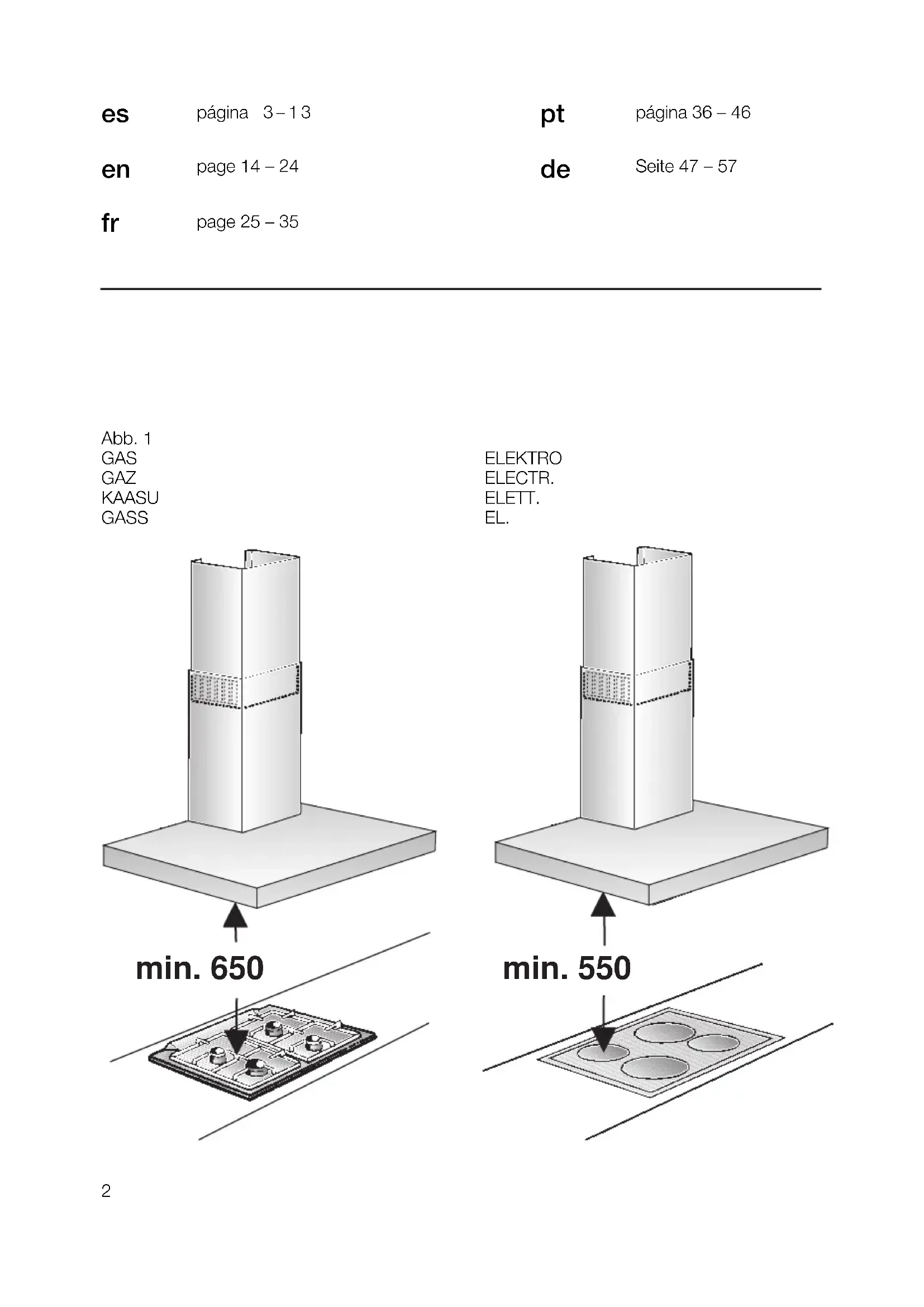 Seite 47 – 57 min. 650 min. 550Descripción del aparato Modalidades de funcionamiento Evacuación del aire hacia el exterior: ❑ El ventilador que incorpora la campana extractora aspira los vahos de la cocina y los evacúa hacia el exterior, haciéndolos pasar previamente a través del filtro antigrasa. ❑ El filtro antigrasa absorbe las partículas sólidas contenidas en los vahos de la cocina. ❑ La cocina queda así prácticamente libre de grasa y olores.