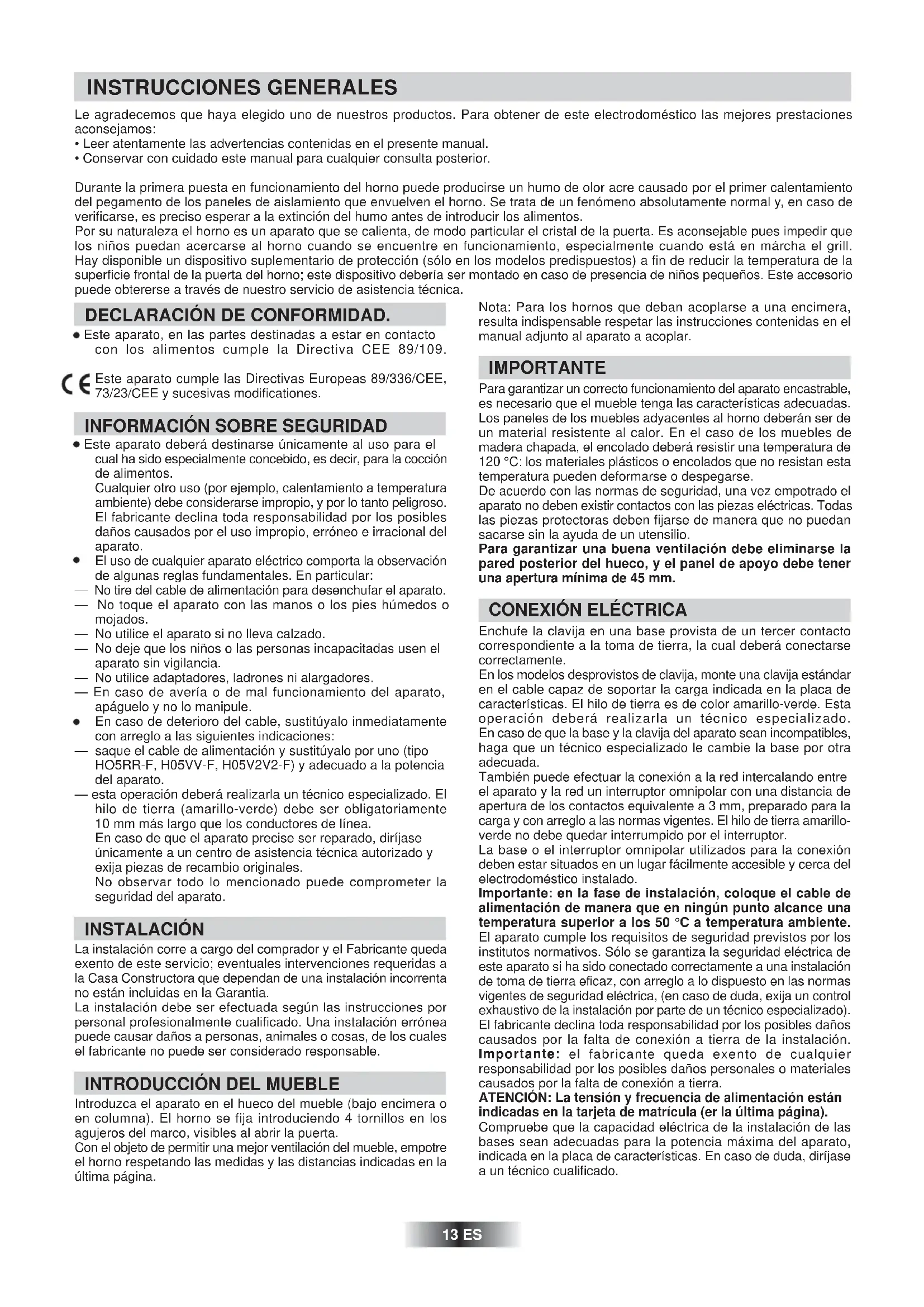 - Conservar con cuidado este manual para cualquier consulta posterior. Durante la primera puesta en funcionamiento del horno puede producirse un humo de olor acre causado por el primer calentamiento del pegamento de los paneles de aislamiento que envuelven el horno. Se trata de un fenómeno absolutamente normal y, en caso de verificarse, es preciso esperar a la extinción del humo antes de introducir los alimentos. Por su naturaleza el horno es un aparato que se calienta, de modo particular el cristal de la puerta. Es aconsejable pues impedir que los niños puedan acercarse al horno cuando se encuentre en funcionamiento, especialmente cuando está en márcha el grill. Hay disponible un dispositivo suplementario de protección (sólo en los modelos predispuestos) a fin de reducir la temperatura de la superficie frontal de la puerta del horno; este dispositivo debería ser montado en caso de presencia de niños pequeños. Este accesorio puede obtererse a través de nuestro servicio de asistencia técnica. INSTRUCCIONES GENERALES DECLARACIÓN DE CONFORMIDAD.