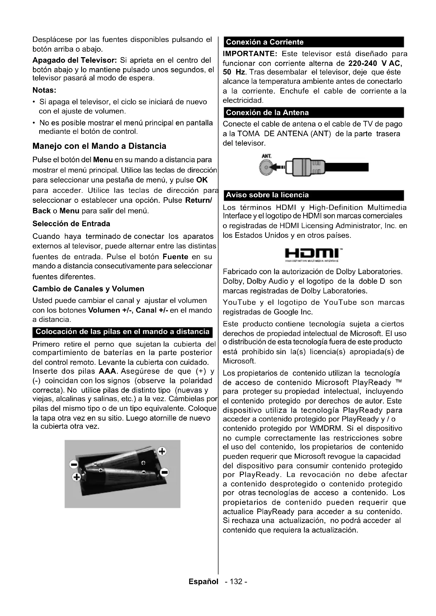 - No es posible mostrar el menú principal en pantalla mediante el botón de control. Manejo con el Mando a Distancia Pulse el botón del Menu en su mando a distancia para mostrar el menú principal. Utilice las teclas de dirección para seleccionar una pestaña de menú, y pulse OK para acceder. Utilice las teclas de dirección para seleccionar o establecer una opción. Pulse Return/ Back o Menu para salir del menú. Selección de Entrada Cuando haya terminado de conectar los aparatos externos al televisor, puede alternar entre las distintas fuentes de entrada. Pulse el botón Fuente en su mando a distancia consecutivamente para seleccionar fuentes diferentes. Cambio de Canales y Volumen Usted puede cambiar el canal y ajustar el volumen con los botones Volumen +/-, Canal +/- en el mando a distancia. Colocación de las pilas en el mando a distancia Primero retire el perno que sujetan la cubierta del compartimiento de baterías en la parte posterior del control remoto. Levante la cubierta con cuidado. Inserte dos pilas AAA. Asegúrese de que (+) y (-) coincidan con los signos (observe la polaridad correcta). No utilice pilas de distinto tipo (nuevas y viejas, alcalinas y salinas, etc.) a la vez. Cámbielas por pilas del mismo tipo o de un tipo equivalente. Coloque la tapa otra vez en su sitio. Luego atornille de nuevo la cubierta otra vez. Conexión a Corriente IMPORTANTE: Este televisor está diseñado para funcionar con corriente alterna de 220-240 V AC, 50 Hz. Tras desembalar el televisor, deje que éste alcance la temperatura ambiente antes de conectarlo a la corriente. Enchufe el cable de corriente a la electricidad. Conexión de la Antena Conecte el cable de antena o el cable de TV de pago a la TOMA DE ANTENA (ANT) de la parte trasera del televisor. Aviso sobre la licencia Los términos HDMI y High-Definition Multimedia Interface y el logotipo de HDMI son marcas comerciales o registradas de HDMI Licensing Administrator, Inc. en los Estados Unidos y en otros países. Fabricado con la autorización de Dolby Laboratories. Dolby, Dolby Audio y el logotipo de la doble D son marcas registradas de Dolby Laboratories. YouTube y el logotipo de YouTube son marcas registradas de Google Inc. Este producto contiene tecnología sujeta a ciertos derechos de propiedad intelectual de Microsoft. El uso o distribución de esta tecnología fuera de este producto está prohibido sin la(s) licencia(s) apropiada(s) de Microsoft. Los propietarios de contenido utilizan la tecnología de acceso de contenido Microsoft PlayReady ™ para proteger su propiedad intelectual, incluyendo el contenido protegido por derechos de autor. Este dispositivo utiliza la tecnología PlayReady para acceder a contenido protegido por PlayReady y / o contenido protegido por WMDRM. Si el dispositivo no cumple correctamente las restricciones sobre el uso del contenido, los propietarios de contenido pueden requerir que Microsoft revogue la capacidad del dispositivo para consumir contenido protegido por PlayReady. La revocación no debe afectar a contenido desprotegido o contenido protegido por otras tecnologías de acceso a contenido. Los propietarios de contenido pueden requerir que actualice PlayReady para acceder a su contenido. Si rechaza una actualización, no podrá acceder al contenido que requiera la actualización.Español - 133 - Información al Usuario Sobre el Desecho de Baterías y Equipos Viejos [Solo Para la Unión Europea]