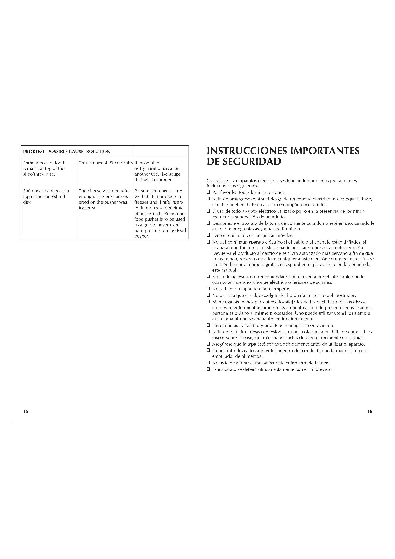PROBLEMA POSIBLECAUSA SOLUCIóN Los alimentos no resultan bien picados. El recipiente está demasi- ado lleno. Usted podría estar haciendo funcionar el aparato continuamente en vez de usar el medio de PULSACIÓN. Los alimentos están siendo picados en porciones irregulares. Las cantidades pequeñas se pueden procesar en porciones más uniformes. Use el botón de pulsación (PULSE) en incrementos de 5 segundos o menos. Espere que las cuchil- las paren del todo antes de presionar este botón nuevamente. Corte los alimentos en tamaños iguales antes de procesarlos. El recipiente gotea por debajo. El recipiente tiene demasiado líquido. Procese cantidades pequeñas. Cuando agregue líquidos, use un máximo de 3 tazas en el recipiente. Cuando use líquidos, nunca retire la cuchilla sin haber qui- tado antes el recipiente del procesador. Las rebanadas quedan desiguales y sesgadas. Los alimentos en el conducto no han sido bien comprimidos o no se le ha aplicado suciente fuerza al empujador al procesar los alimentos. Corte los pedazos en tamaños iguales, un poco más pequeños que el largo del conducto de alimentos. Llene el conducto con cuidado y mantenga presión con- stante sobre el empu- jador, a medida procesa los alimentos. DETECCIóNDEFALLAS L'appareil est muni d'une fiche polarisée (une lame plus large que l'autre). Afin de minimiser les risques de secousses électriques, ce genre de fiche n'entre que d'une façon dans une prise polarisée. Lorsqu'on ne peut insérer la fiche à fond dans la prise, il faut tenter de le faire après avoir inversé les lames de côté. Si la fiche n'entre toujours pas dans la prise, il faut communiquer avec un électricien certifié. Il ne faut pas tenter de modifier la fiche.