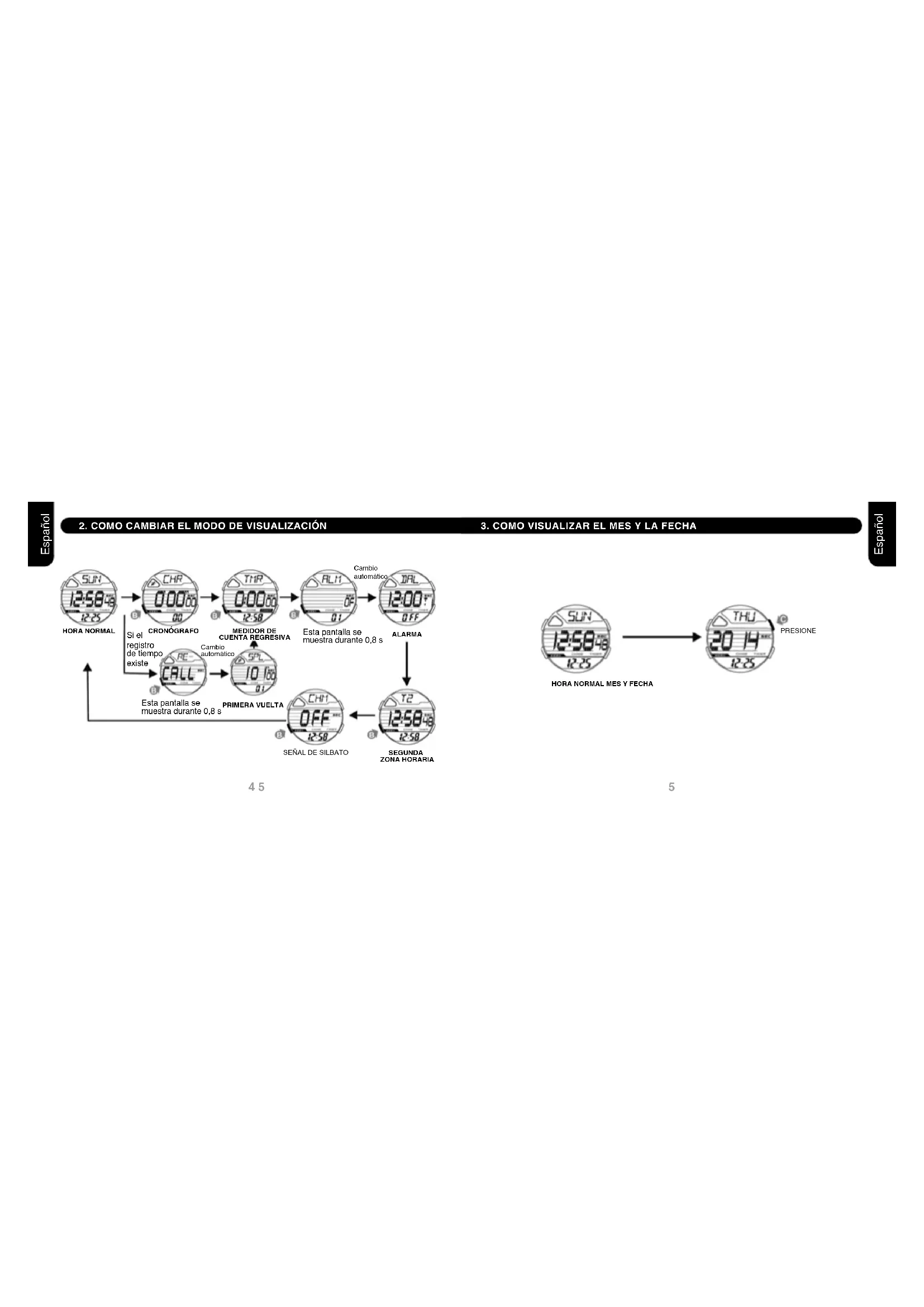 1. MODO DE VISUALIZACIÓN Y OPERACIÓN DE LOS BOTONES2. COMMENT CHANGER LE MODE D’AFFICHAGE 3. COMMENT AFFICHER LE MOIS, LA DATE HEURE NORMALE