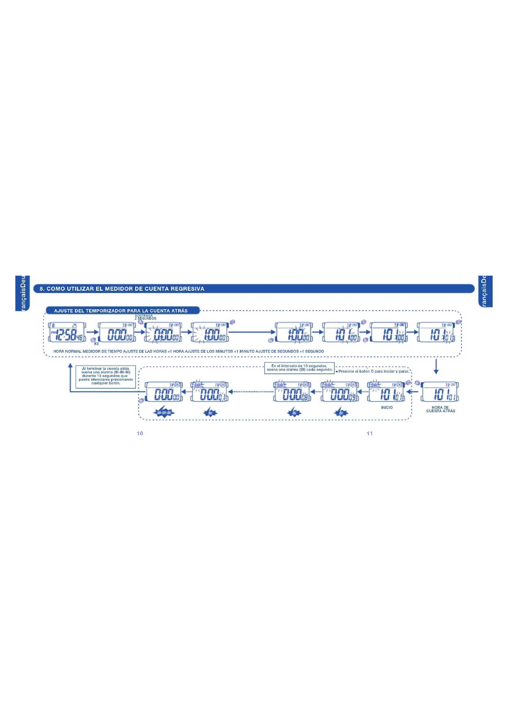 INICIO Presione el botón C para iniciar y parar. Al terminar la cuenta atrás suena una alarma (BI-BI-BI) durante 10 segundos que puede silenciarse presionando cualquier botón. AJUSTE DEL TEMPORIZADOR PARA LA CUENTA ATRÁS En el intervalo de 10 segundos, suena una alarma (BI) cada segundo. SOSTENGA 2 SEGUNDOS9. AJUSTE DE LA SEGUNDA ZONA HORARIA EnglishFrançaisDeutschItaliano Español