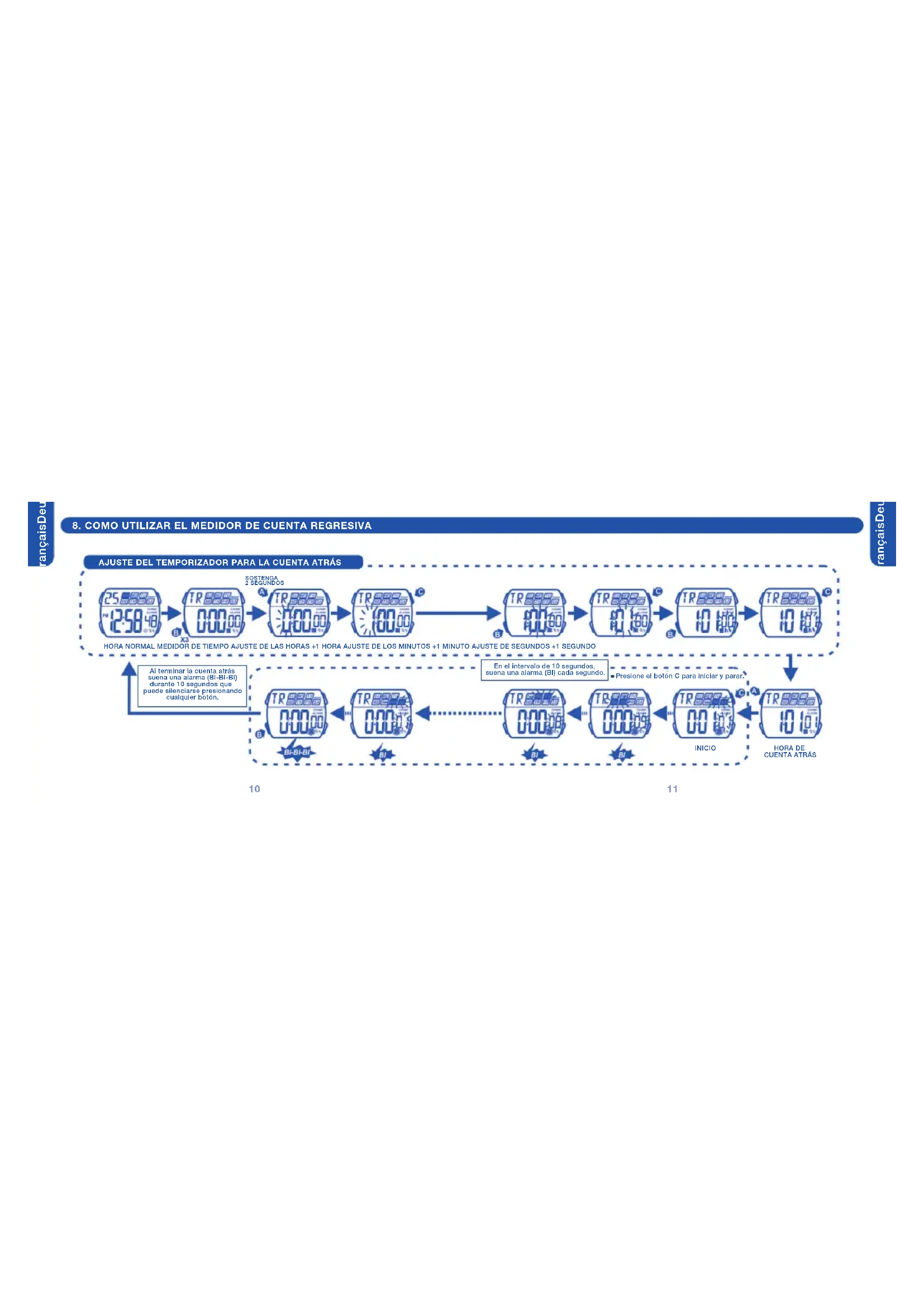 INICIO Presione el botón C para iniciar y parar. Al terminar la cuenta atrás suena una alarma (BI-BI-BI) durante 10 segundos que puede silenciarse presionando cualquier botón. AJUSTE DEL TEMPORIZADOR PARA LA CUENTA ATRÁS En el intervalo de 10 segundos, suena una alarma (BI) cada segundo. SOSTENGA 2 SEGUNDOS9. AJUSTE DE LA SEGUNDA ZONA HORARIA EnglishFrançaisDeutschItaliano Español