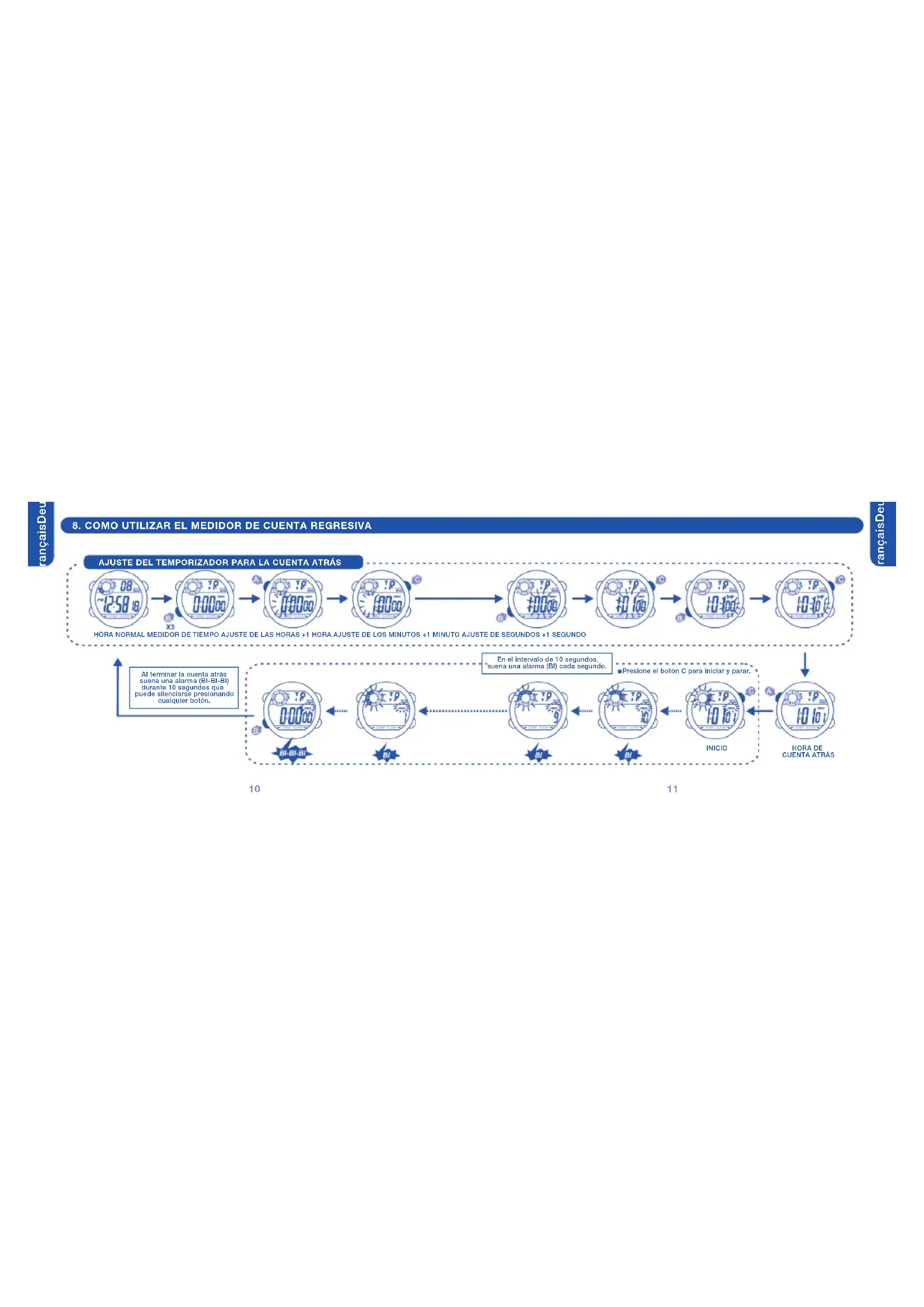 INICIO Presione el botón C para iniciar y parar. En el intervalo de 10 segundos, suena una alarma (BI) cada segundo. Al terminar la cuenta atrás suena una alarma (BI-BI-BI) durante 10 segundos que puede silenciarse presionando cualquier botón. AJUSTE DEL TEMPORIZADOR PARA LA CUENTA ATRÁS9. AJUSTE DE LA SEGUNDA ZONA HORARIA EnglishFrançaisDeutschItaliano Español
