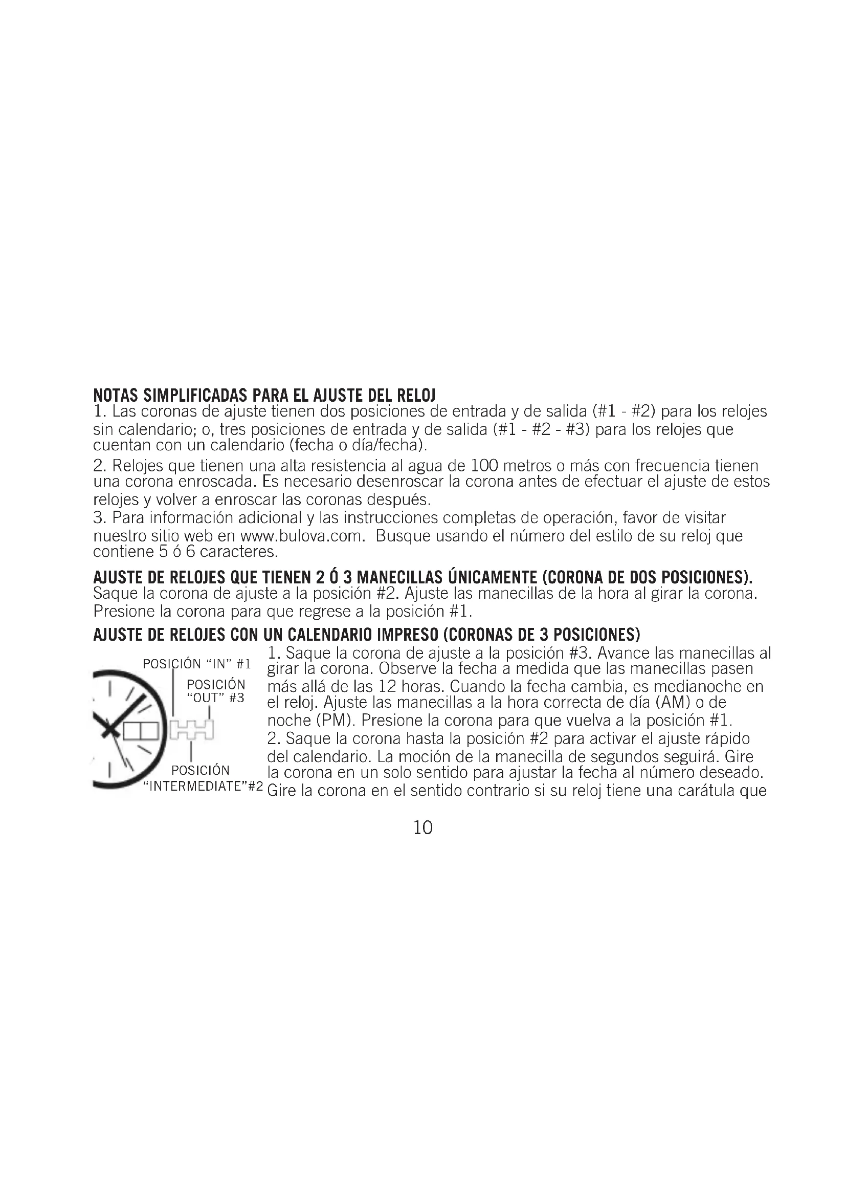 nuestro sitio web en www.bulova.com. Busque usando el número del estilo de su reloj que contiene 5 ó 6 caracteres. AJUSTE DE RELOJES QUE TIENEN 2 Ó 3 MANECILLAS ÚNICAMENTE (CORONA DE DOS POSICIONES). Saque la corona de ajuste a la posición #2. Ajuste las manecillas de la hora al girar la corona. Presione la corona para que regrese a la posición #1. AJUSTE DE RELOJES CON UN CALENDARIO IMPRESO (CORONAS DE 3 POSICIONES)