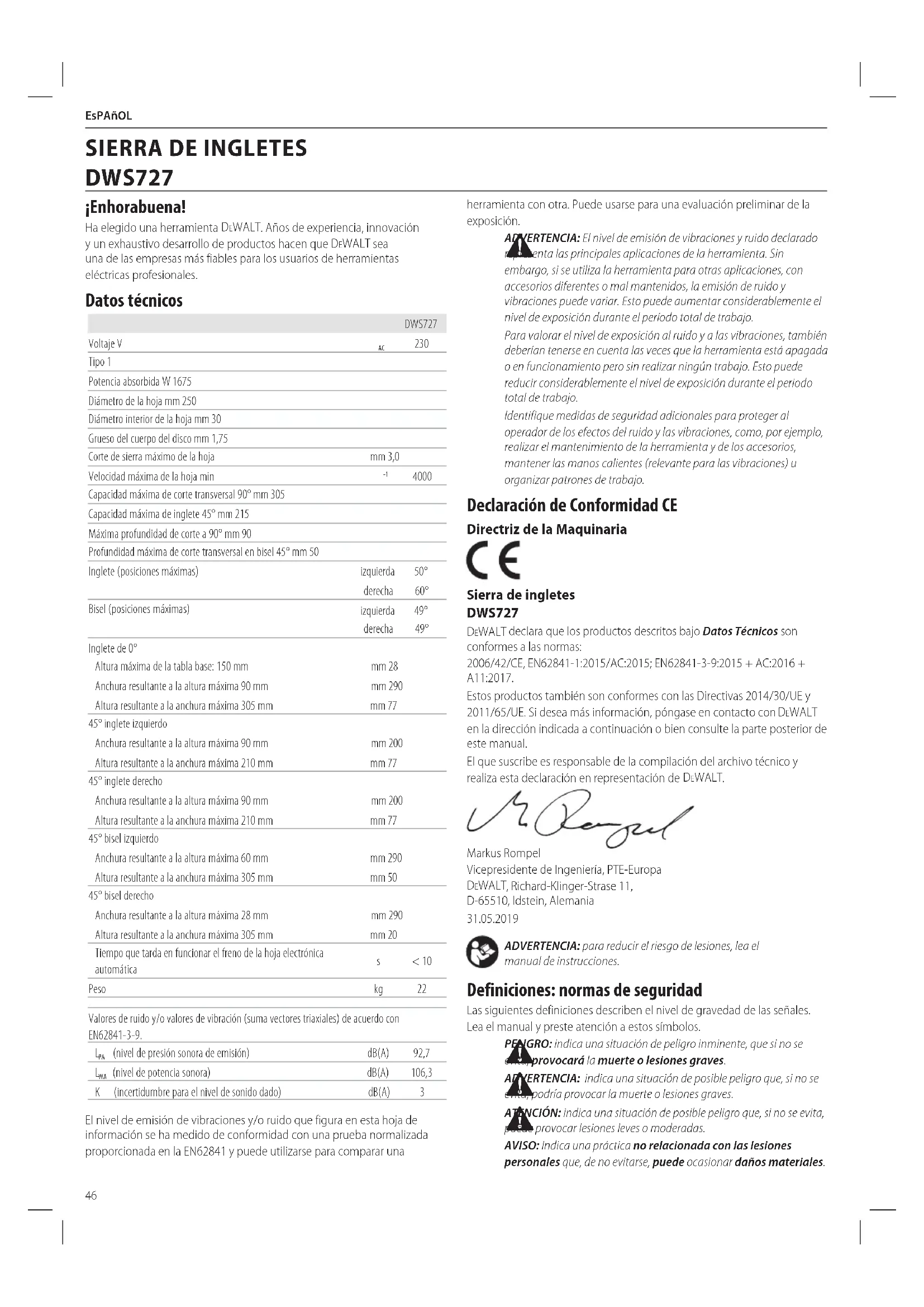 ATENCIÓN: indica una situación de posible peligro que, si no se evita, puede provocar lesiones leves omoderadas. AVISO: Indica una práctica no relacionada con las lesiones personales que, de no evitarse, puede ocasionar dañosmateriales. El nivel de emisión de vibraciones y/o ruido que figura en esta hoja de información se ha medido de conformidad con una prueba normalizada proporcionada en la EN62841 y puede utilizarse para comparar una Declaración de Conformidad CE Directriz de la Maquinaria Sierra de ingletes DWS727 DeWALT declara que los productos descritos bajo Datos Técnicos son conformes a las normas: 2006/42/CE, EN62841-1:2015/AC:2015; EN62841-3-9:2015 + AC:2016 + A11:2017. Estos productos también son conformes con las Directivas 2014/30/UE y 2011/65/UE. Si desea más información, póngase en contacto con DeWALT