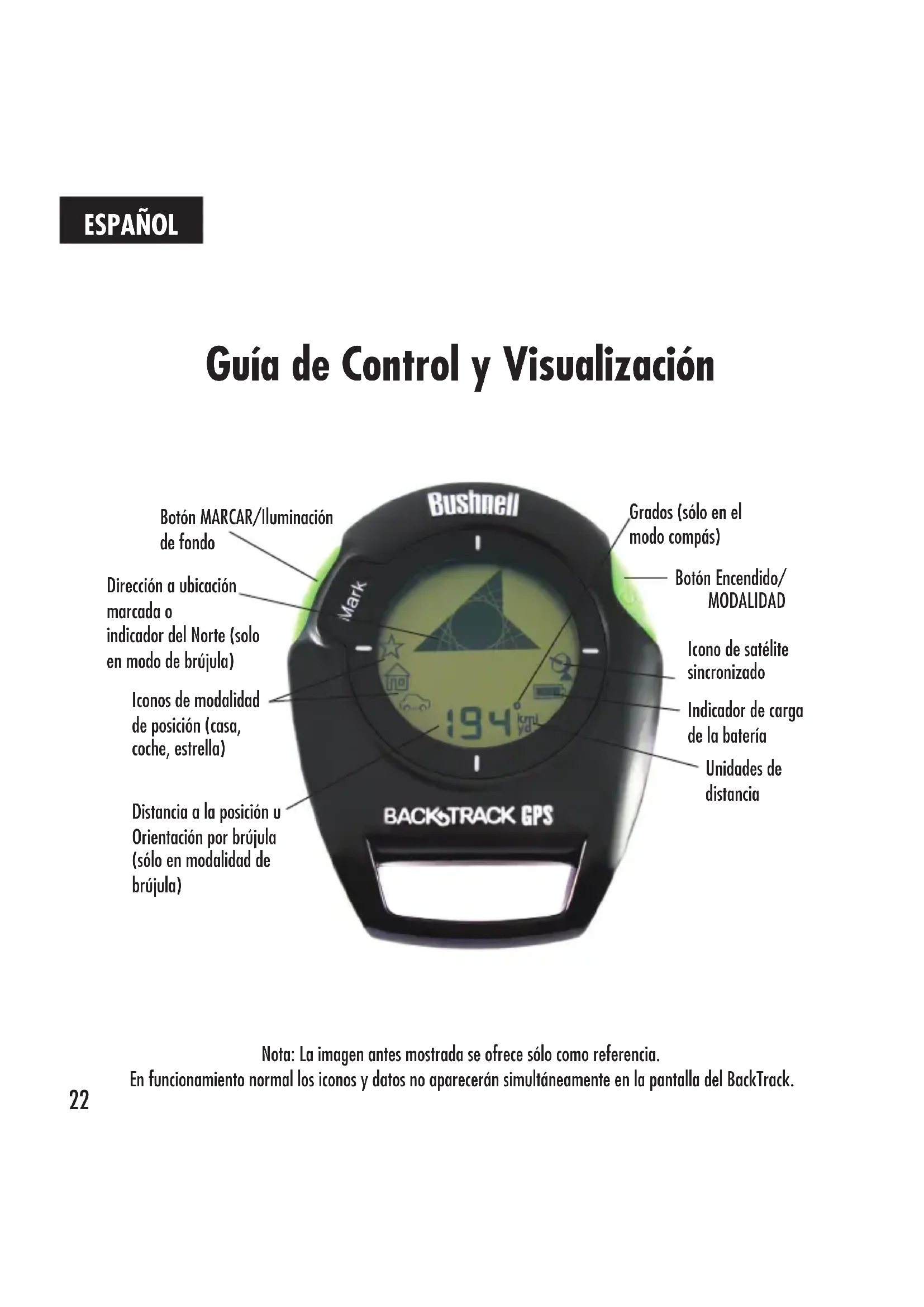 Encendido y MARCAR para seleccionar unidades Métricas o Imperiales para la distancia mostrada (m y km o yd y mi). PULSE MARCAR para activar la iluminación de fondo PULSE MANTENGA PULSADO MANTENGA PULSADO En una modalidad de posición29 Advertencias y Avisos Aviso sobre el sistema GPS y la precisión de la posición: El Sistema de Posicionamiento Global (GPS) está gestionado por el Gobierno de Estados Unidos, que es el único responsable de su precisión y mantenimiento. El sistema está sujeto a cambios que podrían afectar la precisión y las prestaciones de todos los equipos GPS. La propia naturaleza intrínseca del sistema GPS limita la precisión de la distancia indicada en la pantalla del BackTrack a unos ±3~5 metros (o yardas) de la posición real marcada. Atención: Este dispositivo portátil se ha diseñado únicamente como ayuda adicional a la navegación. El usuario asume toda la responsabilidad asociada a la utilización de este producto. No debe ser utilizado con ningún objetivo que necesite una medición precisa de posición, dirección, distancia, velocidad o topografía. Este dispositivo no debe usarse en ninguna aplicación de navegación aérea. Aviso sobre la utilización en vehículos: Bushnell está comprometida con el disfrute seguro y responsable del aire libre. No utilice este producto mientras conduce. Si el conductor no actúa conforme a las prácticas de conducción prudente, el resultado puede ser un accidente que provoque daños materiales, lesiones o muerte. El conductor de cualquier vehículo es el único responsable de conducirlo de forma segura. La información de la unidad de GPS puede distraer al conductor de un vehículo a motor. No es seguro accionar los controles de la unidad de GPS mientras se conduce un vehículo a motor. Si se utiliza en un vehículo a motor, no debe utilizarlo el conductor del vehículo. Si se utiliza en un vehículo a motor, debe montarse de forma que no distraiga al conductor ni interfiera con su campo de visión, ni interfiera ni bloquee los airbags ni cualquier otro mecanismo de seguridad del motor. Los parabrisas y ventanillas de coche con materiales metálicos integrados, como desescarchadores o películas de tintado de las ventanas, pueden degradar la recepción del GPS dentro del coche. Aviso sobre responsabilidad: Bushnell rechaza cualquier responsabilidad por cualquier daño incidente, especial, indirecto o consecuente resultante del uso, mal uso, o incapacidad de usar este producto o de los defectos del producto. En algunos estados no se permiten la exclusión de daños consecuentes o incidentales, de modo que las limitaciones anteriores no se aplican a usted si es el caso. Las especicaciones y diseños están sujetos a cambios sin ningún aviso u obligación por parte del fabricante. Eliminación de equipos eléctricos y electrónicos (Aplicable en la UE y otros países europeos con sistemas de recogida separada) Este equipo contiene elementos eléctricos o electrónicos y por tanto no debe eliminarse con los residuos domésticos normales. En cambio, debe eliminarse en los correspondientes puntos de recogida para reciclaje previstos por las comunidades. Para usted resultará gratuito. Si el equipo incorpora baterías intercambiables (recargables), estas también deben retirarse antes y, si es necesario, eliminarlas de acuerdo con las regulaciones correspondientes (consulte también los comentarios al efecto de las instrucciones de estas unidades). La administración de su comunidad, su empresa local de recogida o la tienda en la que adquirió este equipo pueden proporcionarle información adicional sobre este tema.30 GARANTÍA LIMITADA de UN AÑO Su Bushnell