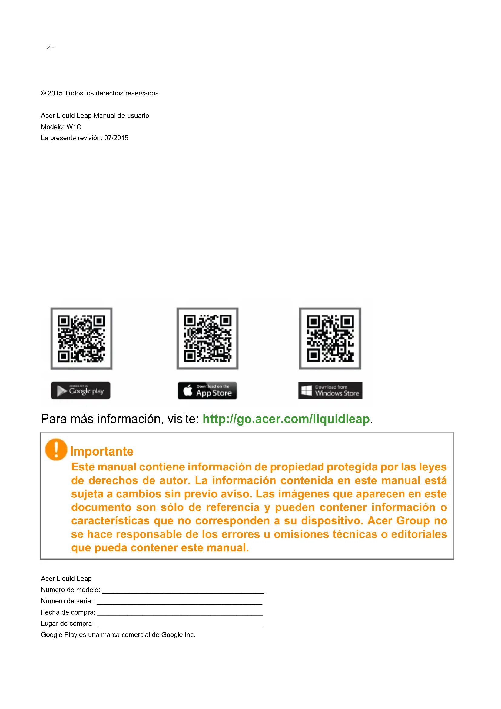 Todas las exenciones de garantías y las limitaciones de responsabilidad expresadas en este Acuerdo prevalecerán al cese del presente Acuerdo. GENERAL Este Acuerdo representa el acuerdo completo entre usted y Acer en relación con esta licencia del Software y sustituye a todo acuerdo, comunicación, propuesta o representación previos entre las partes, prevaleciendo en caso de conflicto o de términos adiciones de cualquier índole, orden, conocimiento o comunicado similar. Este Acuerdo solo se puede modificar mediante un documento escrito firmado por ambas partes. Si alguna disposición de este Acuerdo se define por un juez de una jurisdicción competente como contraria a la ley, dicha disposición se ejecutará en la máxima medida permitida y las disposiciones restantes de este Acuerdo permanecerán con plena vigencia y efectos.34 - Acuerdo de licencia para el usuario final DISPOSICIONES ADICIONALES APLICABLES AL SOFTWARE Y A LOS SERVICIOS DE TERCEROS El Software facilitado a continuación por los licenciatarios o proveedores de Acer ("Software de terceros") se pone a su disposición únicamente para un uso personal y no comercial. Usted no podrá utilizar el Software de terceros de modo que pueda dañar, deshabilitar, sobrecargar o impedir los servicios proporcionados por los licenciatarios o proveedores de Acer a continuación ("Servicios de terceros"). Además, no podrá utilizar el Software de terceros de modo que pueda interferir con el uso y disfrute que terceras partes hagan de los Servicios de terceros, o de los servicios y productos de los licenciatarios de Acer o de los licenciatarios de terceros de los proveedores. Su uso del Software de terceros y de los Servicios de terceros también está sujeto a términos, condiciones y políticas adicionales a las que puede acceder a través de nuestro sitio web global. Política de privacidad Durante el registro se le pedirá que le envíe información a Acer. Consulte la política de privacidad de Acer en www.acer.com o en el sitio web de Acer de su país.คู่มือผู้ใช ้2 - © 2015