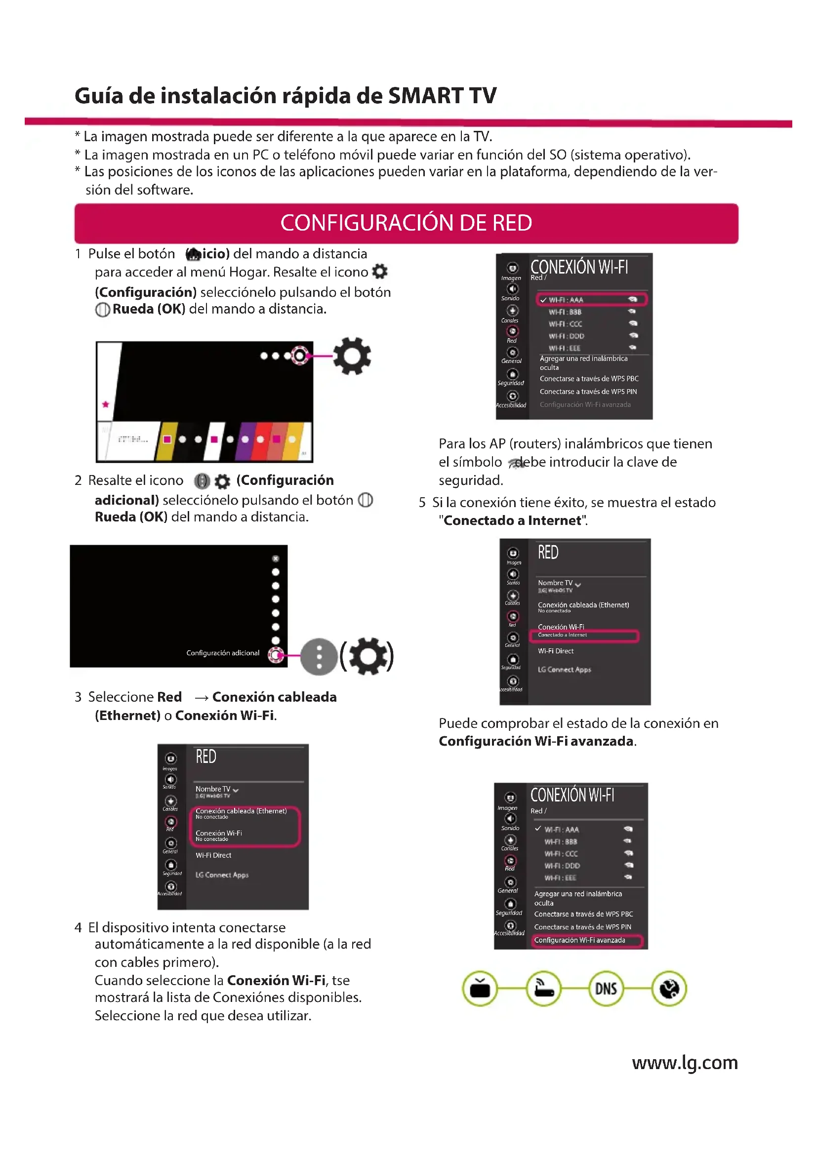 - Las posiciones de los iconos de las aplicaciones pueden variar en la plataforma, dependiendo de la ver- sión del software. Guía de instalación rápida de SMART TV www.lg.comSolución de problemas de red 1 Pulse el botón (Inicio) del mando a distancia para acceder al menú Hogar. Resalte el icono (Configuración) selecciónelo pulsando el botón Rueda (OK) del mando a distancia. 2 Resalte el icono ( ) (Configuración adicional) selecciónelo pulsando el botón Rueda (OK) del mando a distancia. Configuración adicional