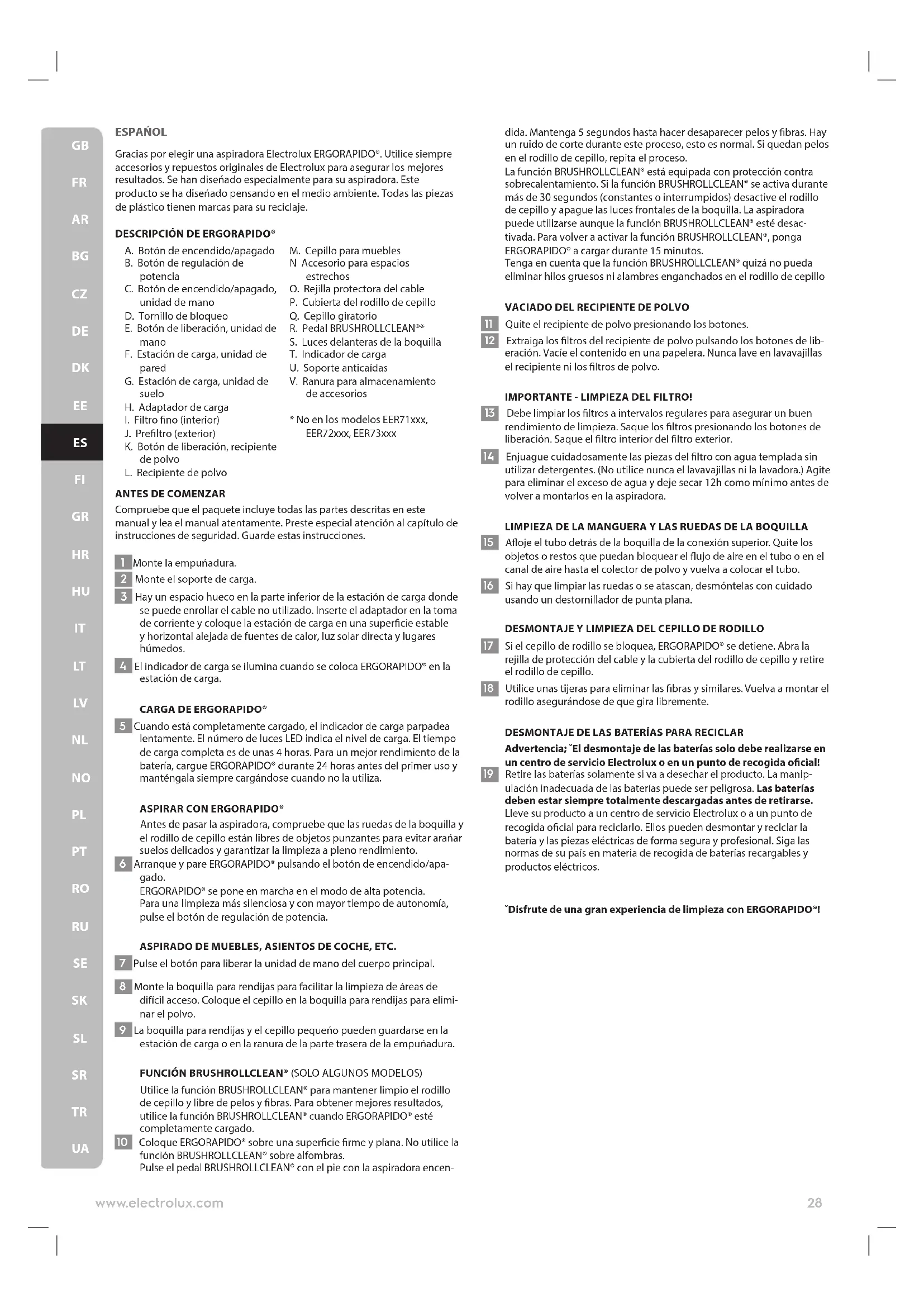 UAESPAŃOL Gracias por elegir una aspiradora Electrolux ERGORAPIDO®. Utilice siempre accesorios y repuestos originales de Electrolux para asegurar los mejores resultados. Se han diseńado especialmente para su aspiradora. Este producto se ha diseńado pensando en el medio ambiente. Todas las piezas de plástico tienen marcas para su reciclaje.