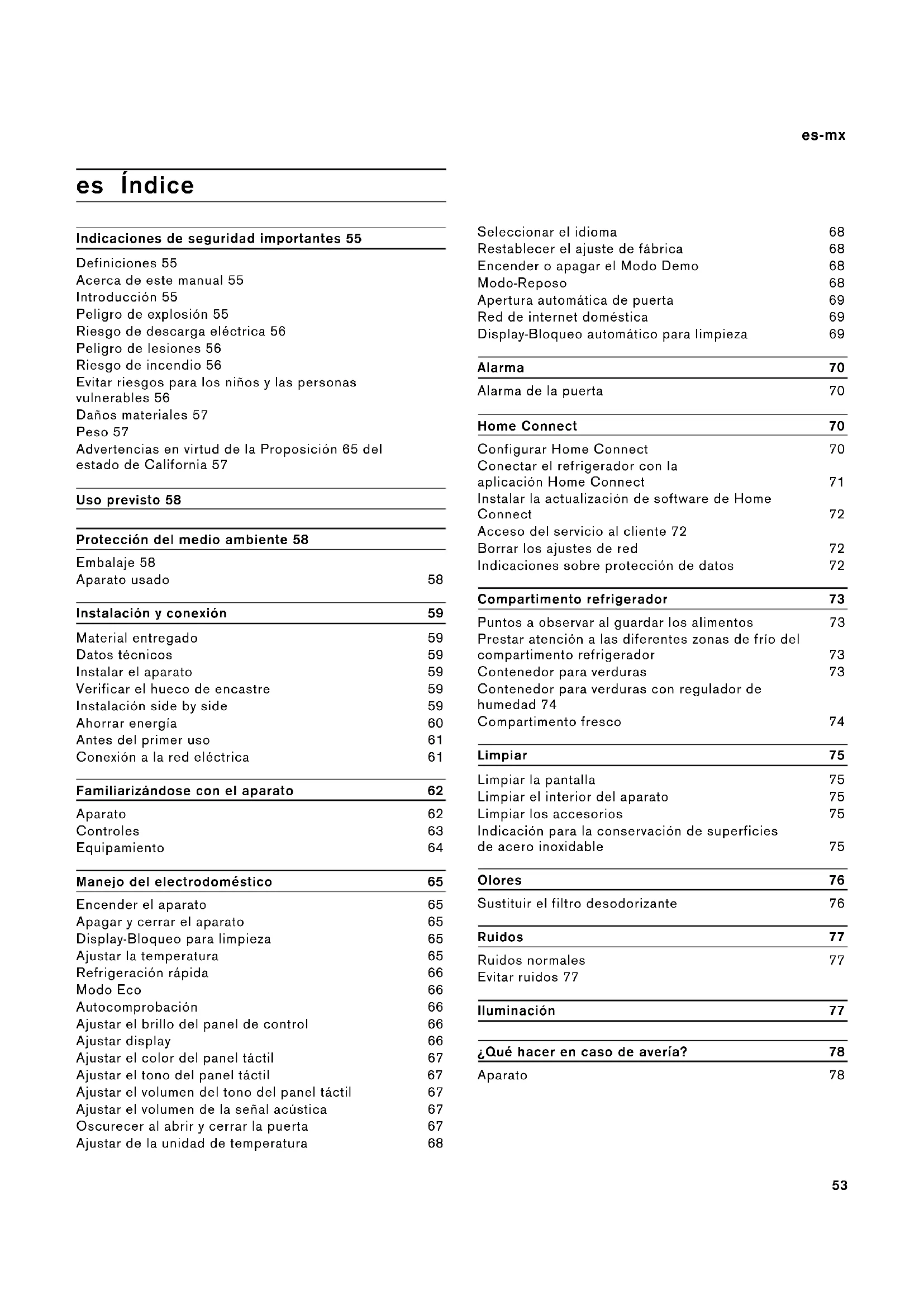 É-U 877 442 4436 Sans frais53 es-mx es Índice es Instrucciones de uso Indicaciones de seguridad importantes 55 Definiciones 55 Acerca de este manual 55 Introducción 55 Peligro de explosión 55 Riesgo de descarga eléctrica 56 Peligro de lesiones 56 Riesgo de incendio 56 Evitar riesgos para los niños y las personas vulnerables 56 Daños materiales 57 Peso 57 Advertencias en virtud de la Proposición 65 del estado de California 57 Uso previsto 58 Protección del medio ambiente 58 Embalaje 58 Aparato usado 58 Instalación y conexión 59 Material entregado 59 Datos técnicos 59 Instalar el aparato 59 Verificar el hueco de encastre 59 Instalación side by side 59 Ahorrar energía 60 Antes del primer uso 61 Conexión a la red eléctrica 61 Familiarizándose con el aparato 62 Aparato 62 Controles 63 Equipamiento 64 Manejo del electrodoméstico 65 Encender el aparato 65 Apagar y cerrar el aparato 65 Display-Bloqueo para limpieza 65 Ajustar la temperatura 65 Refrigeración rápida 66 Modo Eco 66 Autocomprobación 66 Ajustar el brillo del panel de control 66 Ajustar display 66 Ajustar el color del panel táctil 67 Ajustar el tono del panel táctil 67 Ajustar el volumen del tono del panel táctil 67 Ajustar el volumen de la señal acústica 67 Oscurecer al abrir y cerrar la puerta 67 Ajustar de la unidad de temperatura 68 Seleccionar el idioma 68 Restablecer el ajuste de fábrica 68 Encender o apagar el Modo Demo 68 Modo-Reposo 68 Apertura automática de puerta 69 Red de internet doméstica 69 Display-Bloqueo automático para limpieza 69 Alarma 70 Alarma de la puerta 70 Home Connect 70 Configurar Home Connect 70 Conectar el refrigerador con la aplicación Home Connect 71 Instalar la actualización de software de Home Connect 72 Acceso del servicio al cliente 72 Borrar los ajustes de red 72 Indicaciones sobre protección de datos 72 Compartimento refrigerador 73 Puntos a observar al guardar los alimentos 73 Prestar atención a las diferentes zonas de frío del compartimento refrigerador 73 Contenedor para verduras 73 Contenedor para verduras con regulador de humedad 74 Compartimento fresco 74 Limpiar 75 Limpiar la pantalla 75 Limpiar el interior del aparato 75 Limpiar los accesorios 75 Indicación para la conservación de superficies de acero inoxidable 75 Olores 76 Sustituir el filtro desodorizante 76 Ruidos 77 Ruidos normales 77 Evitar ruidos 77 Iluminación 77 ¿Qué hacer en caso de avería? 78 Aparato 7854 es-mx Servicio al cliente 79 Autoprueba del aparato 79 Solicitud de reparación y asesoramiento en caso de averías 7955 9 Indicaciones de seguridad importantes ¡LEER Y CONSERVAR ESTAS INDICACIONES!