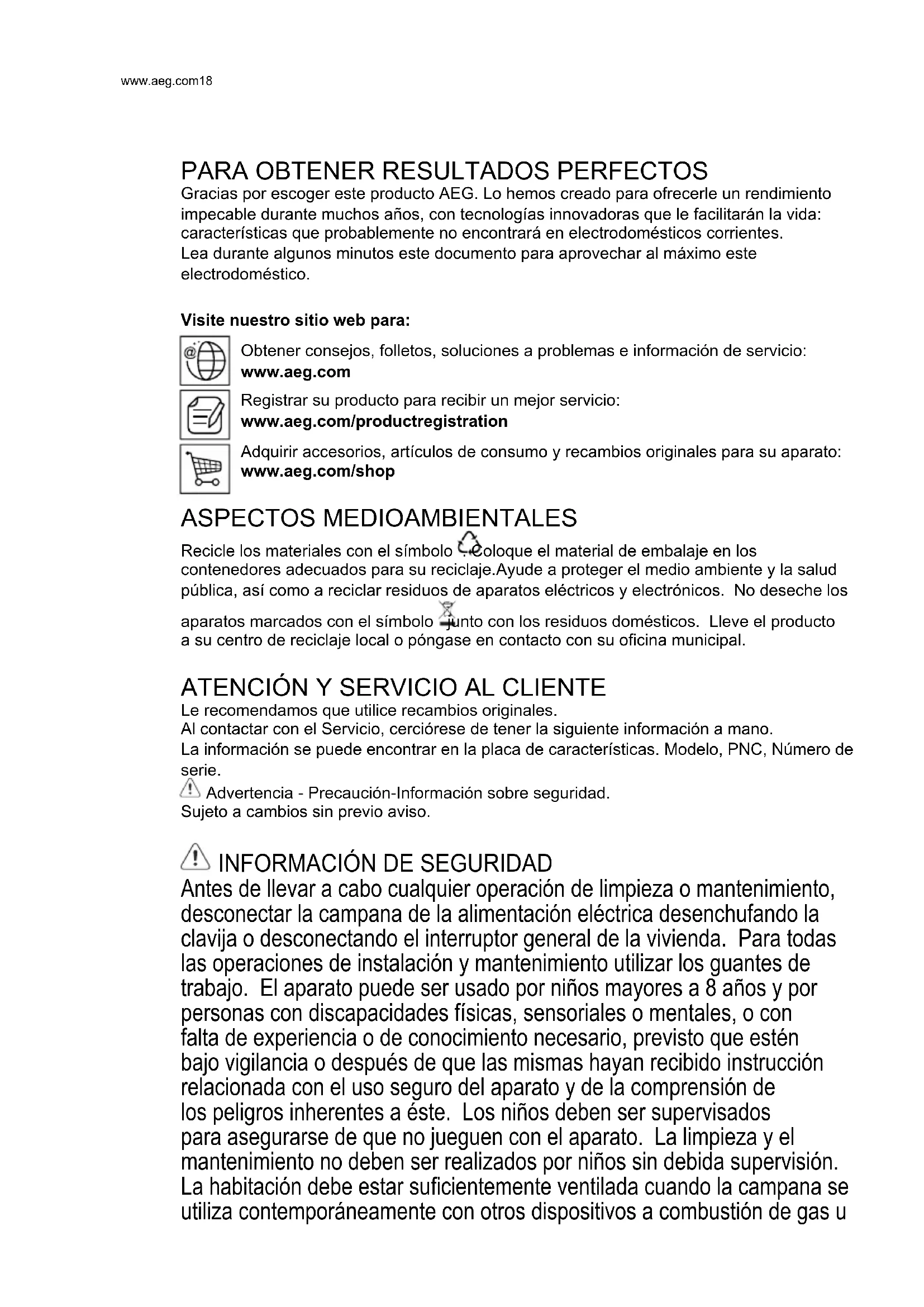 Gracias por escoger este producto AEG. Lo hemos creado para ofrecerle un rendimiento impecable durante muchos años, con tecnologías innovadoras que le facilitarán la vida: características que probablemente no encontrará en electrodomésticos corrientes. Lea durante algunos minutos este documento para aprovechar al máximo este electrodoméstico. Visite nuestro sitio web para: Obtener consejos, folletos, soluciones a problemas e información de servicio: www.aeg.com Registrar su producto para recibir un mejor servicio: www.aeg.com/productregistration Adquirir accesorios, artículos de consumo y recambios originales para su aparato: www.aeg.com/shop ASPECTOS MEDIOAMBIENTALES Recicle los materiales con el símbolo . Coloque el material de embalaje en los contenedores adecuados para su reciclaje.Ayude a proteger el medio ambiente y la salud pública, así como a reciclar residuos de aparatos eléctricos y electrónicos. No deseche los aparatos marcados con el símbolo junto con los residuos domésticos. Lleve el producto a su centro de reciclaje local o póngase en contacto con su ocina municipal.